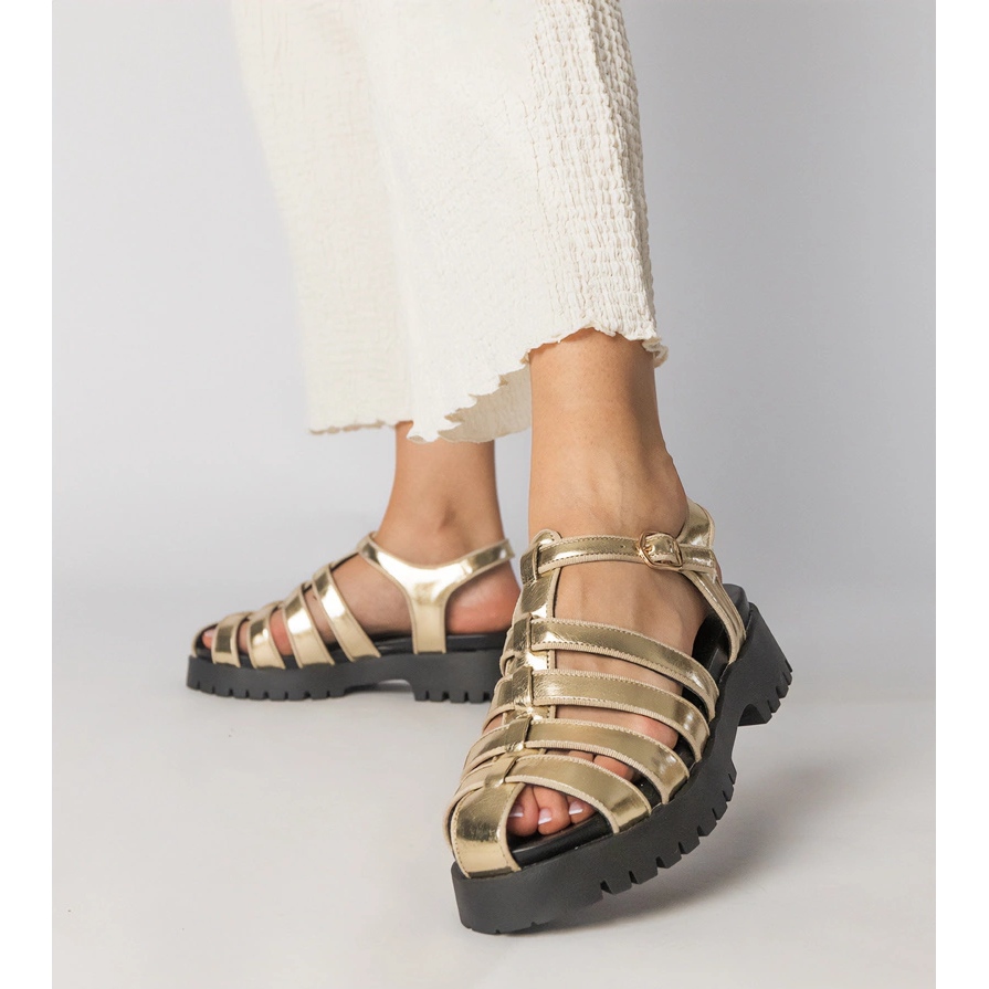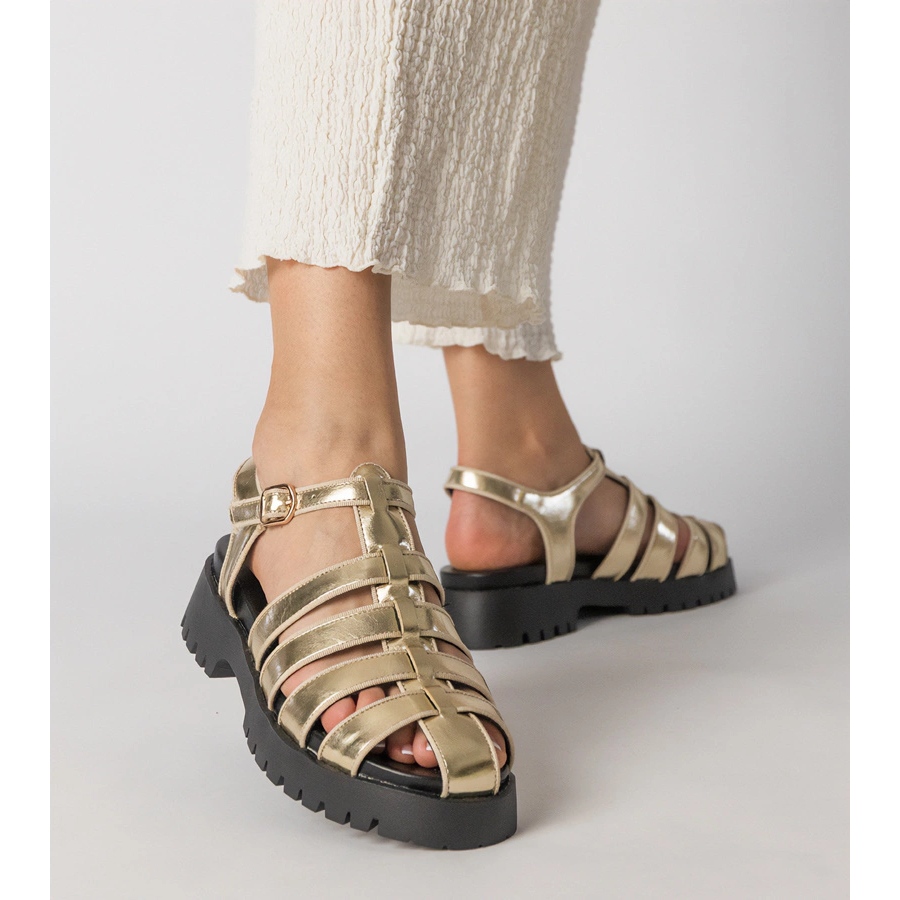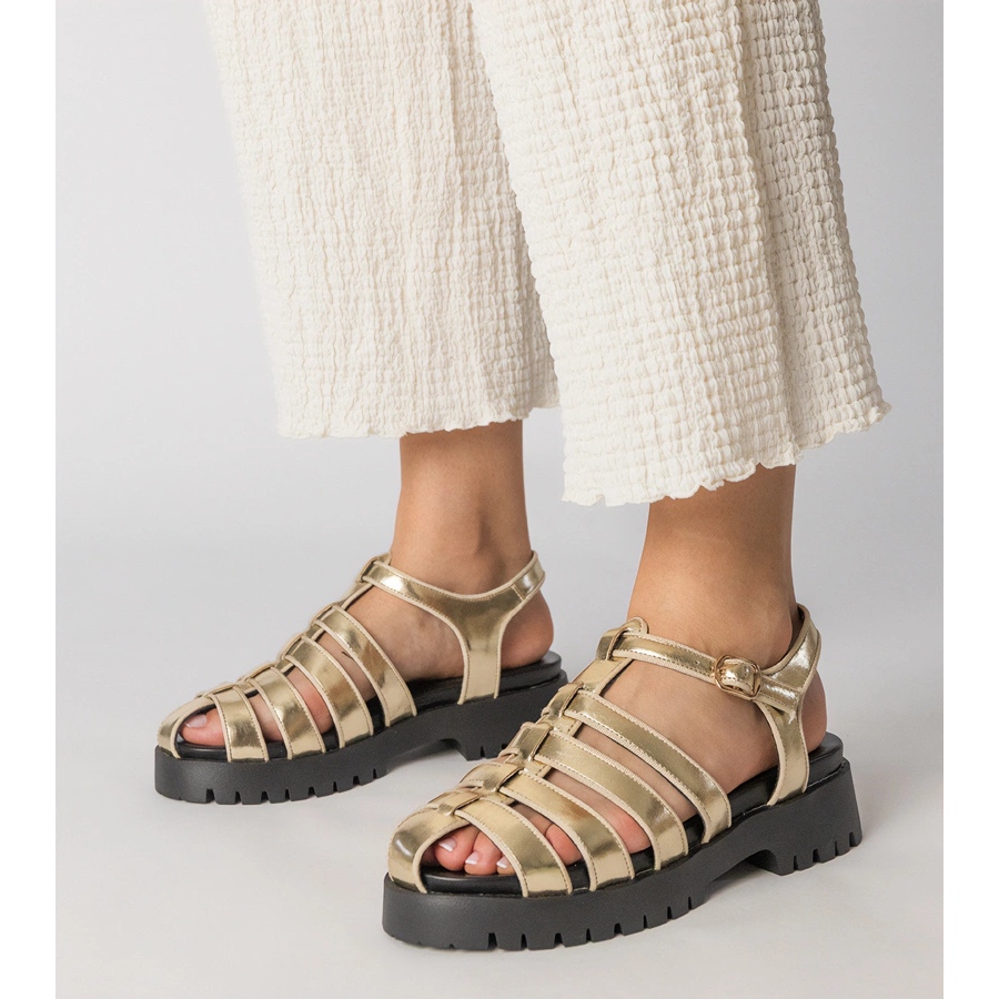 Les sandales dorées se distinguent par une finition métallique, qui ajoutera de la splendeur à tout style. Grâce à la conduite de doigts construite et aux orteils ronds, ils offrent un confort de port maximal, et la boucle pratique le facilite la mise en place et la suppression des chaussures. La hauteur de la plate-forme de 5 cm garantit un amorti adéquat, ce qui en fait le choix parfait pour les longues journées d'été.