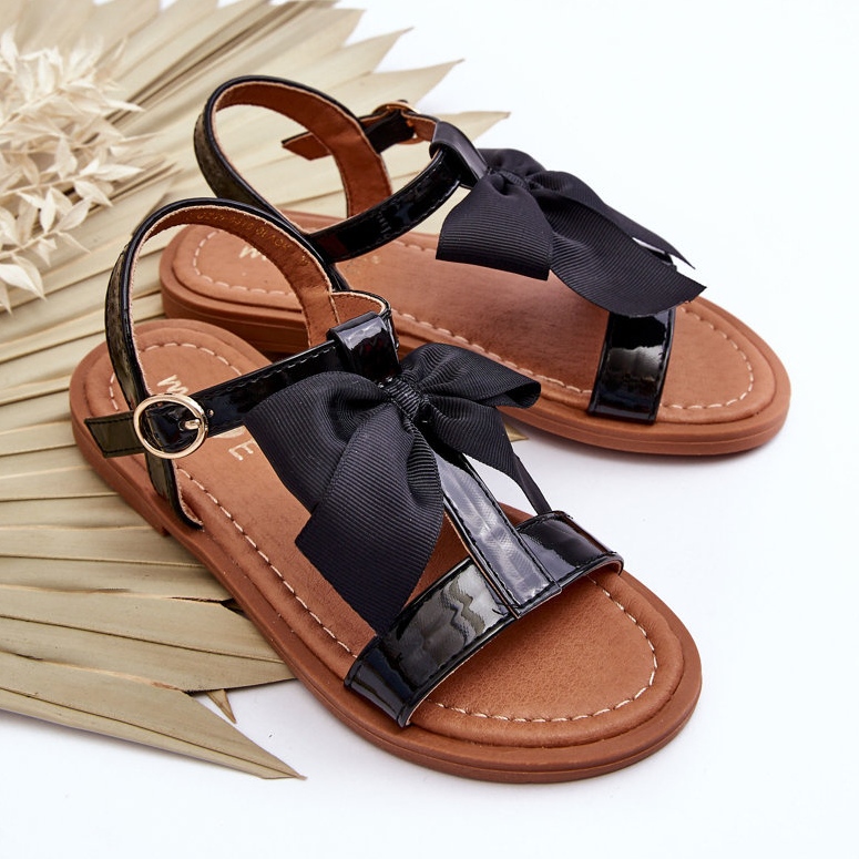 Le produit est des sandales pour enfants de Miss, conçues pour les filles. Ils sont fabriqués en cuir écologique, un choix conscient et respectueux de l'environnement. Un trait caractéristique de ces sandales est un nœud noir au milieu, ce qui leur donne du charme. La finition noire complète le style.