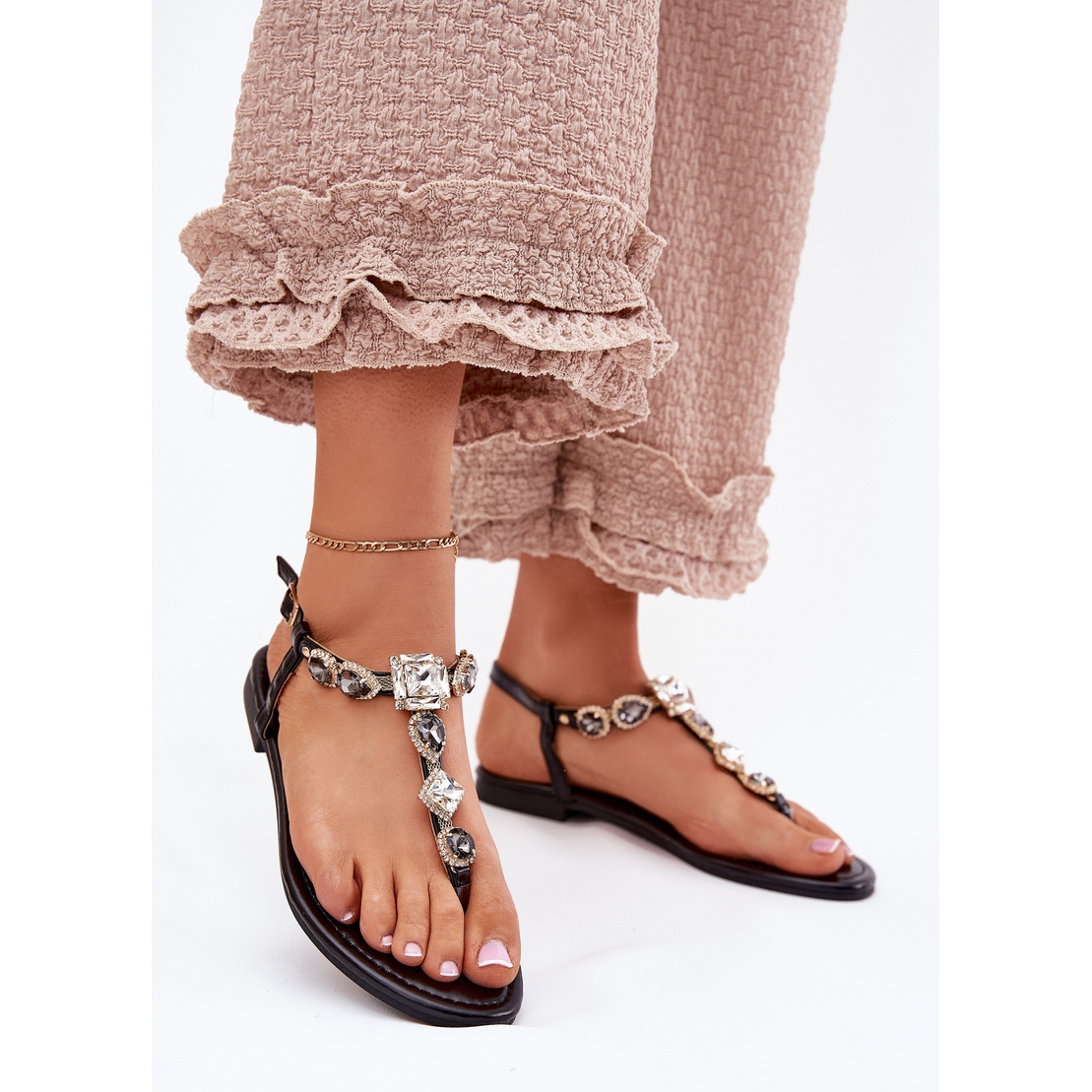 Découvrez des sandales féminines à thèmes plates uniques avec des cristaux dans une couleur noire élégante. Ces sandales élégantes, en cuir écologique, sont un excellent choix pour les journées d'été chaudes. Grâce au talon plat avec une hauteur de 1,5 cm, vous pouvez profiter d'un maximum de confort tout au long de la journée, quelle que soit l'occasion.