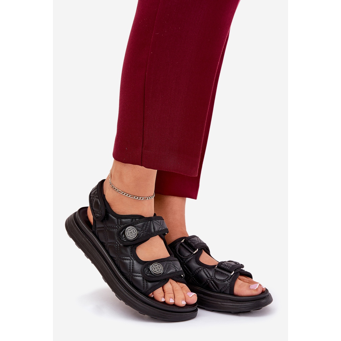 Découvrez les sandales féminines uniques avec des détails fermeture scratch décoratifs en noir minimaliste, qui combinent le style, le confort et la fonctionnalité. Fabriqués en cuir écologique de haute qualité, ces sandales sont parfaites pour les stylisations d'été. Situé sur une plate-forme de 3 cm de haut, ils offrent un réconfort à porter toute la journée, ce qui en fait le choix parfait les jours chauds.