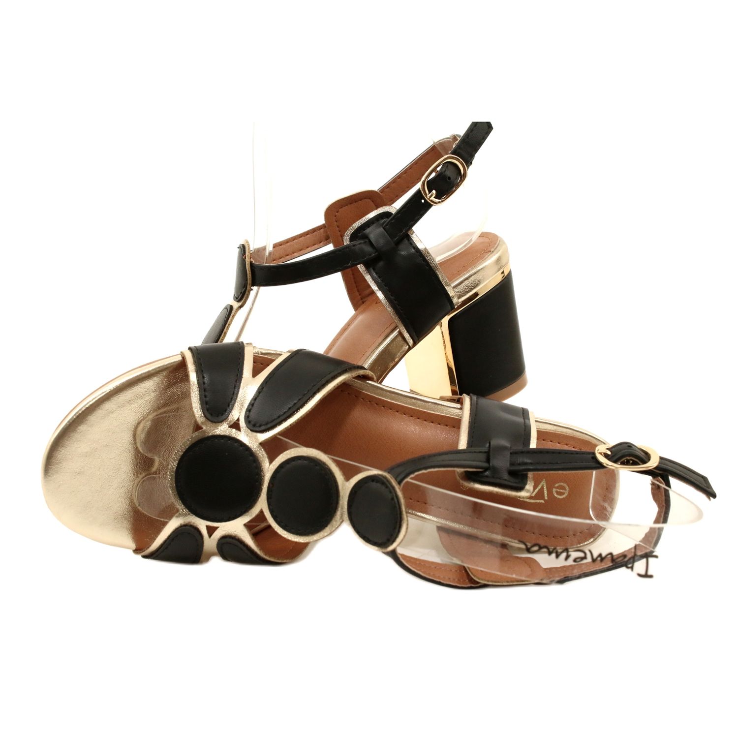 Sandales classiques élégantes qui ajouteront du style à tout style. Fabriqué en cuir écologique de haute qualité avec un insert de cuir écologique confortable, dans une combinaison spectaculaire de noir et d'or. Le poteau de 7 cm de haut offre un aspect féminin tout en maintenant la stabilité et le confort. Le devant ouvert et la tige décorative créent une coupe universelle, idéale pour les sorties solennelles et pour un usage quotidien.