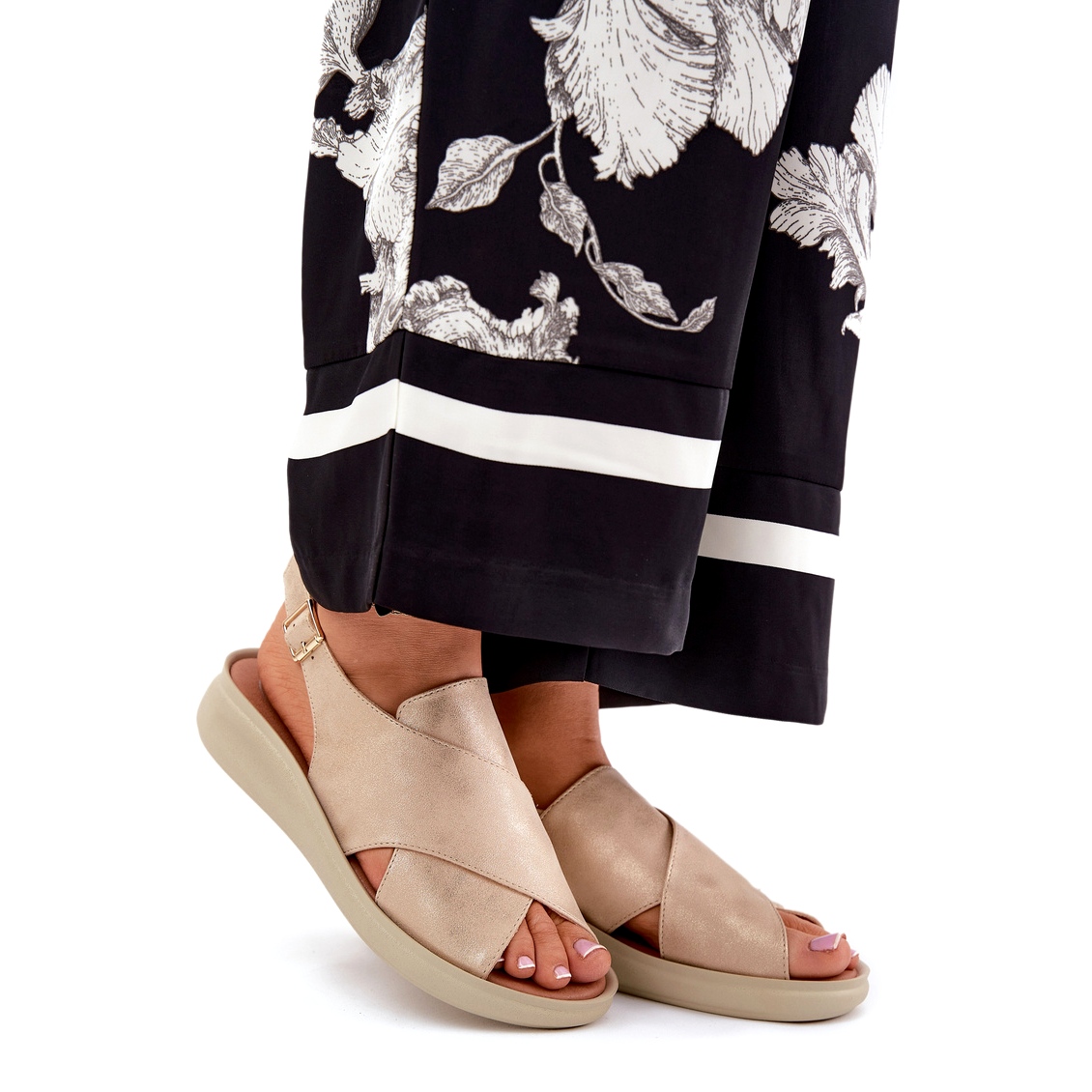 La ceinture réglable avec une boucle garantit un ajustement parfait à chaque pied, et deux bretelles entrelacées et entrelacées à l'avant donnent aux chaussures un personnage de mode. Light et confortable, ces sandales en or seront un complément parfait à diverses stylifications d'été - à la fois décontractées et plus élégantes.