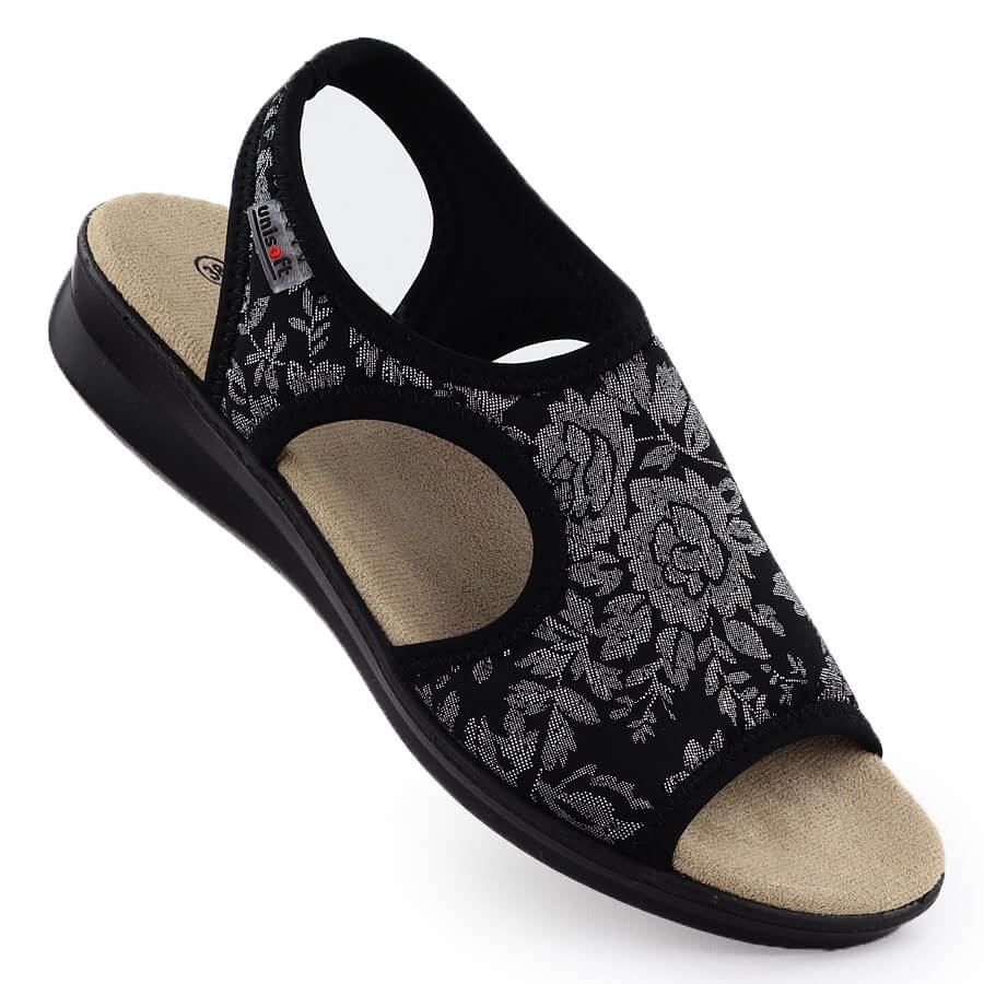 Détails: Sandales féminines sur une éruption cutanée flexible avec des fleurs noires unisoft 7196
