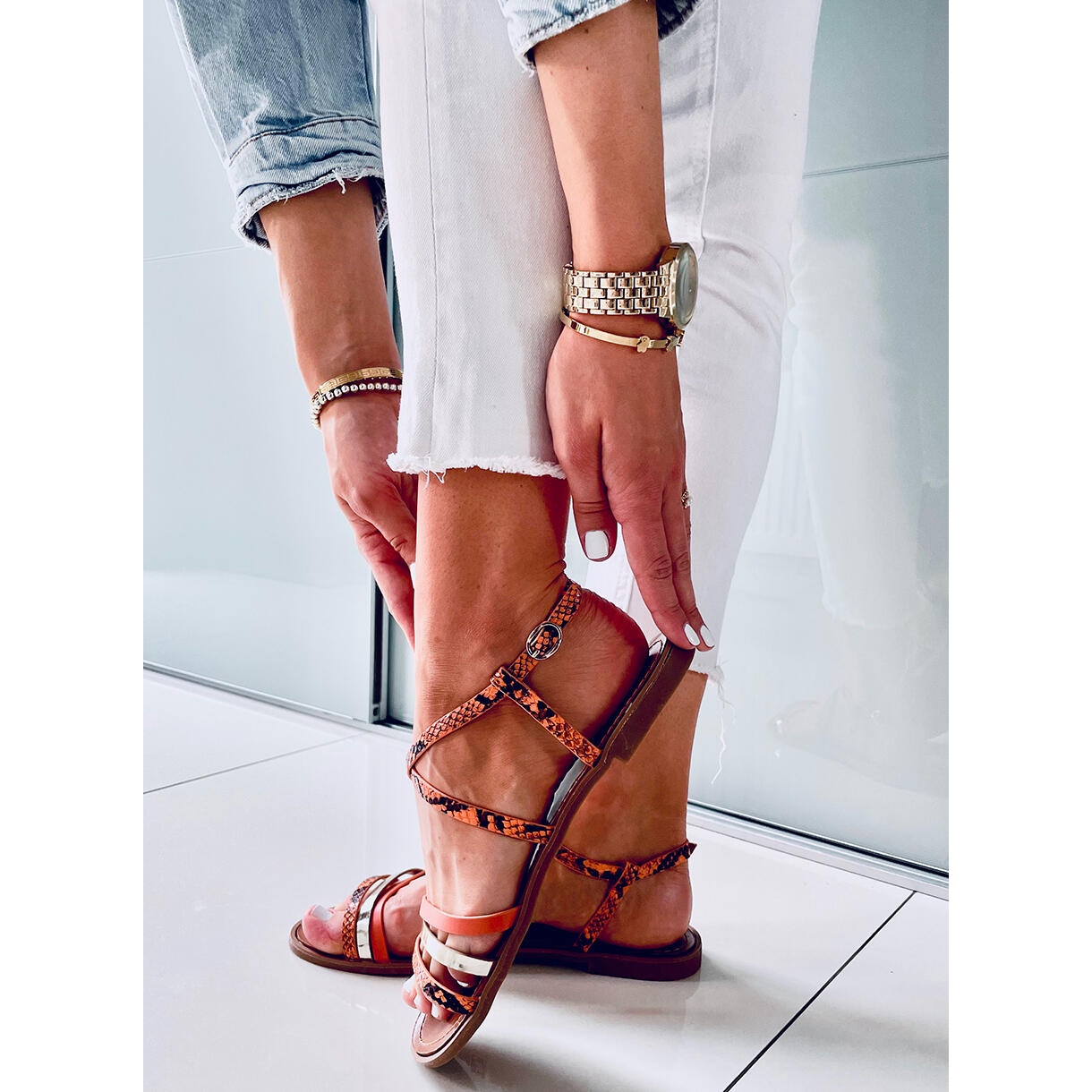 Découvrez les sandales femme Bavi Orange dans un superbe coloris orange, qui seront une véritable décoration de votre tenue d'été ! Ces sandales plates uniques se distinguent non seulement par leur teinte intense, mais également par un accent métallique qui leur ajoute élégance et style.