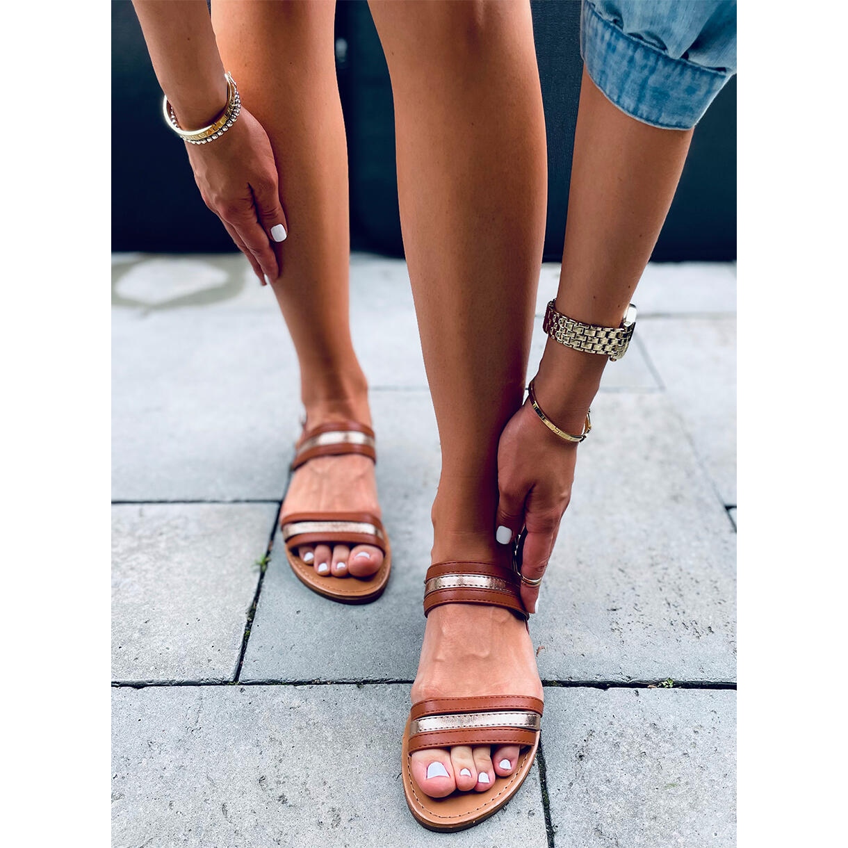 Ils se distinguent des autres modèles par des détails métalliques uniques qui leur confèrent un caractère moderne. Une semelle plate d'une hauteur de 1,0 cm assure le confort, et le matériau synthétique de la semelle les rend durables et résistantes à un usage quotidien.