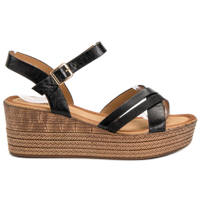 La cale de 5,5 cm de hauteur allonge optiquement les jambes, rendant chaque style plus élégant. Sans nez, avec un talon fermé et une boucle fonctionnelle, ils sont pratiques à porter et en même temps extrêmement élégants. Le matériau de la semelle intérieure en cuir écologique garantit le confort et la semelle synthétique assure une adhérence et une durabilité adéquates.
