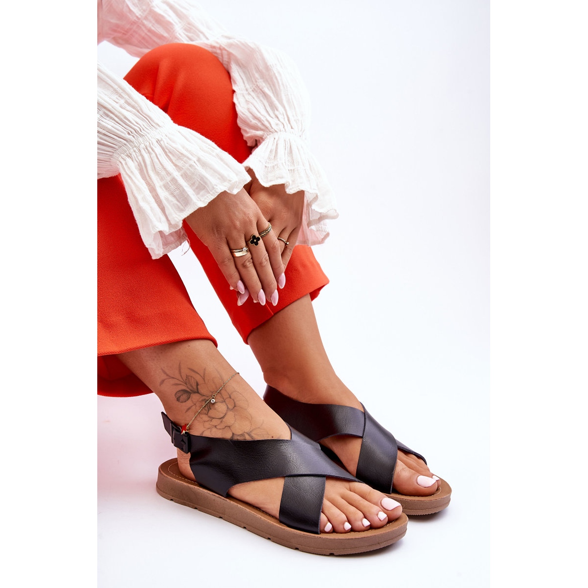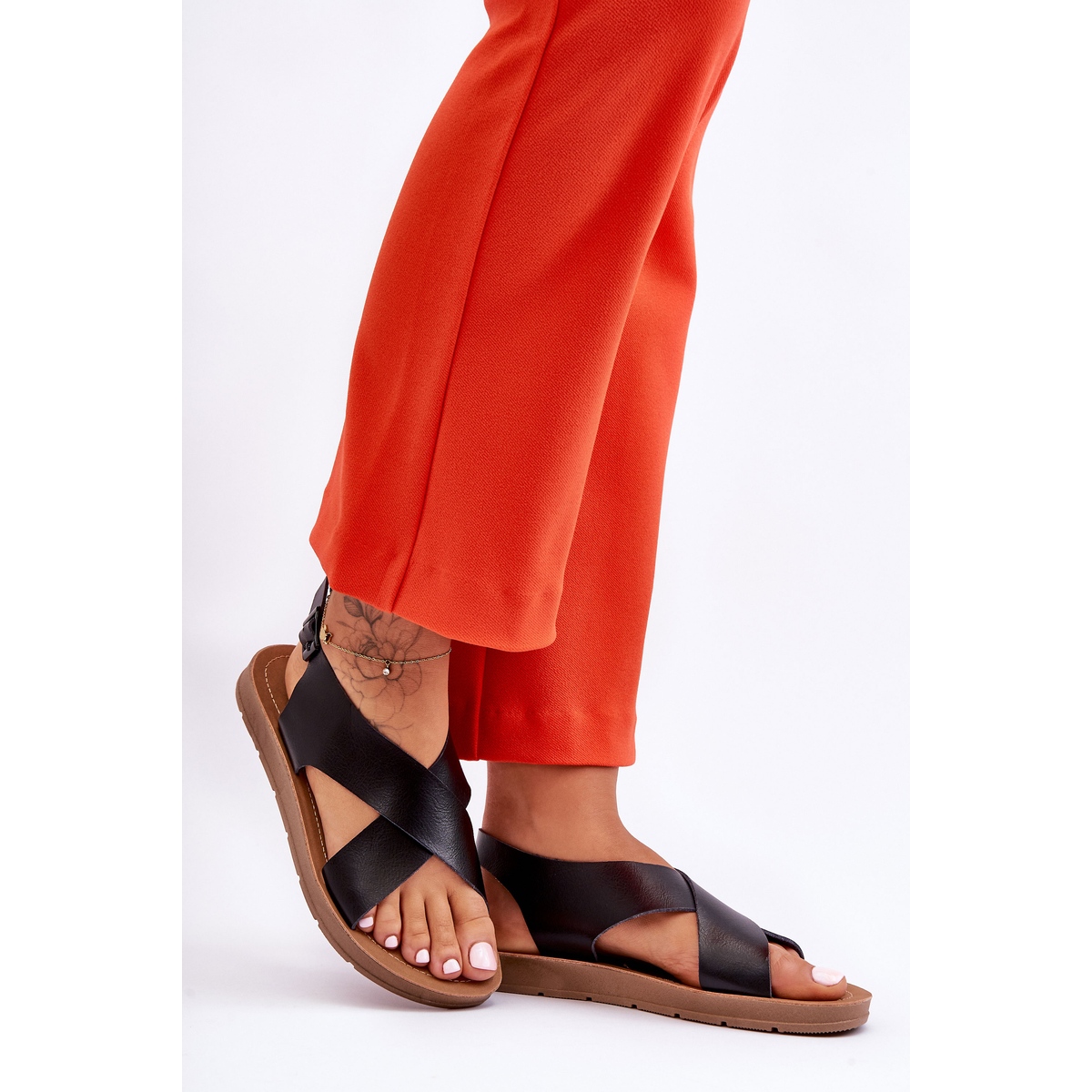 Ce modèle se caractérise par un design élégant et une fermeture pratique avec une sangle réglable avec boucle, qui permet de l'ajuster à n'importe quel pied. Une plateforme délicate de 2 cm de haut rend les sandales confortables pour les longues promenades et souligne en même temps tout style décontracté.