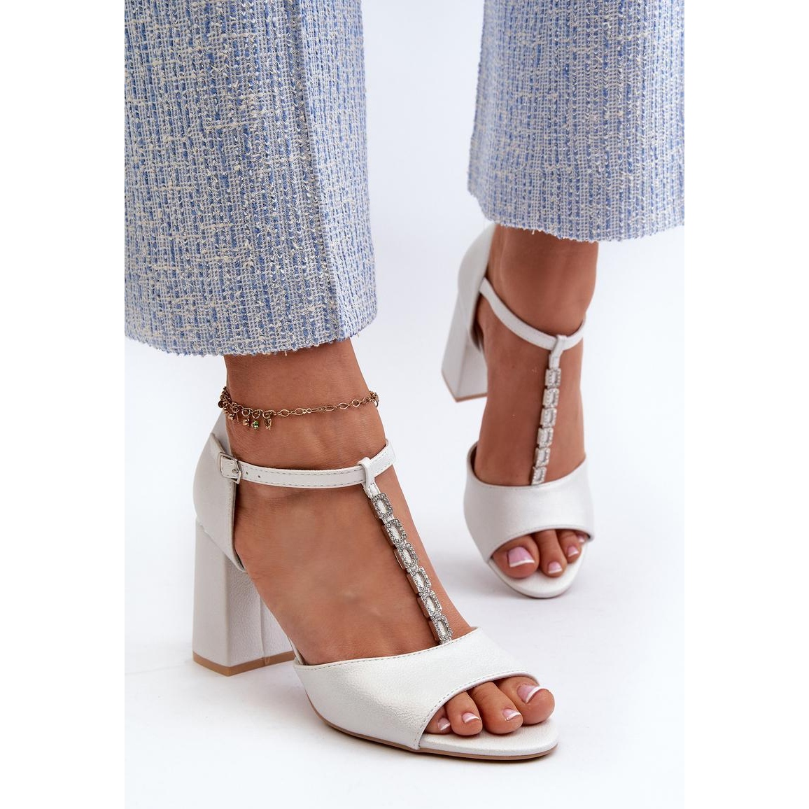 Les sandales classiques pour femmes sont faites de cuir écologique. Ce modèle est orné de strass scintillants imitant des zircons. Les sandales ont un talon raidi et une semelle intérieure souple en éco-cuir. Ce modèle est doté d'un talon bloc et se ferme à l'aide d'une bride réglable avec boucle.