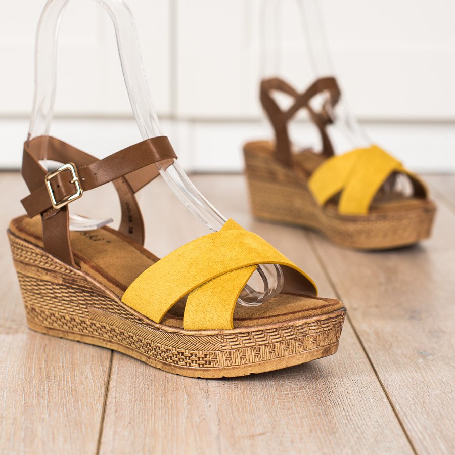 S. BARSKI Les sandales compensées S.BARSKI marron et jaune sont le choix parfait pour les femmes qui apprécient le style et le confort. Ces sandales élégantes, fabriquées en simili cuir de haute qualité et en daim écologique, sont une combinaison parfaite entre modernité et design classique. Les brides des sandales dans les tons marron et jaune leur donnent du caractère, et la fermeture à boucle sur le côté assure un enfilage facile et un ajustement parfait au pied.
