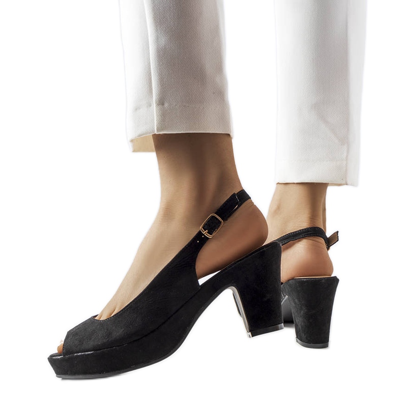 Les sandales noires sur le Post Dionne combinent une forme classique avec le minimalisme moderne. Fabriqué en daim écologique et en écot, avec un insert en cuir écologique confortable et une semelle en plastique durable. Le talon de 7 cm de haut fournit une certaine étape et la boucle réglable permet un ajustement parfait.