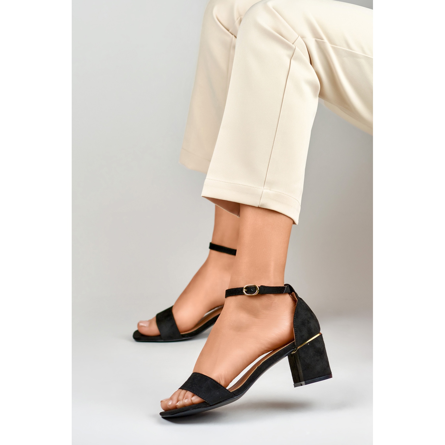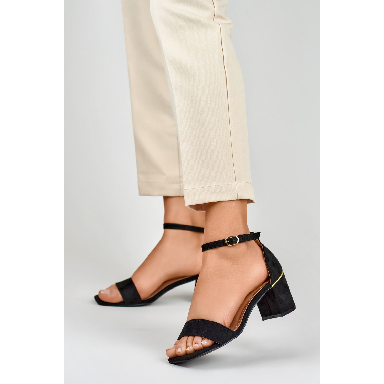 Les sandales noires se caractérisent par un bout ouvert et un subtil accessoire doré qui ajoute du chic. Grâce à un talon bas de 6 centimètres en forme de talon bloc, elles seront un choix idéal aussi bien pour les styles de tous les jours que pour les plus élégants. La semelle intérieure confortable en cuir écologique permet de porter ces sandales au plus haut niveau.