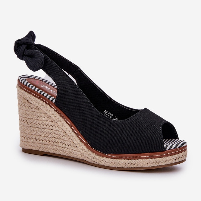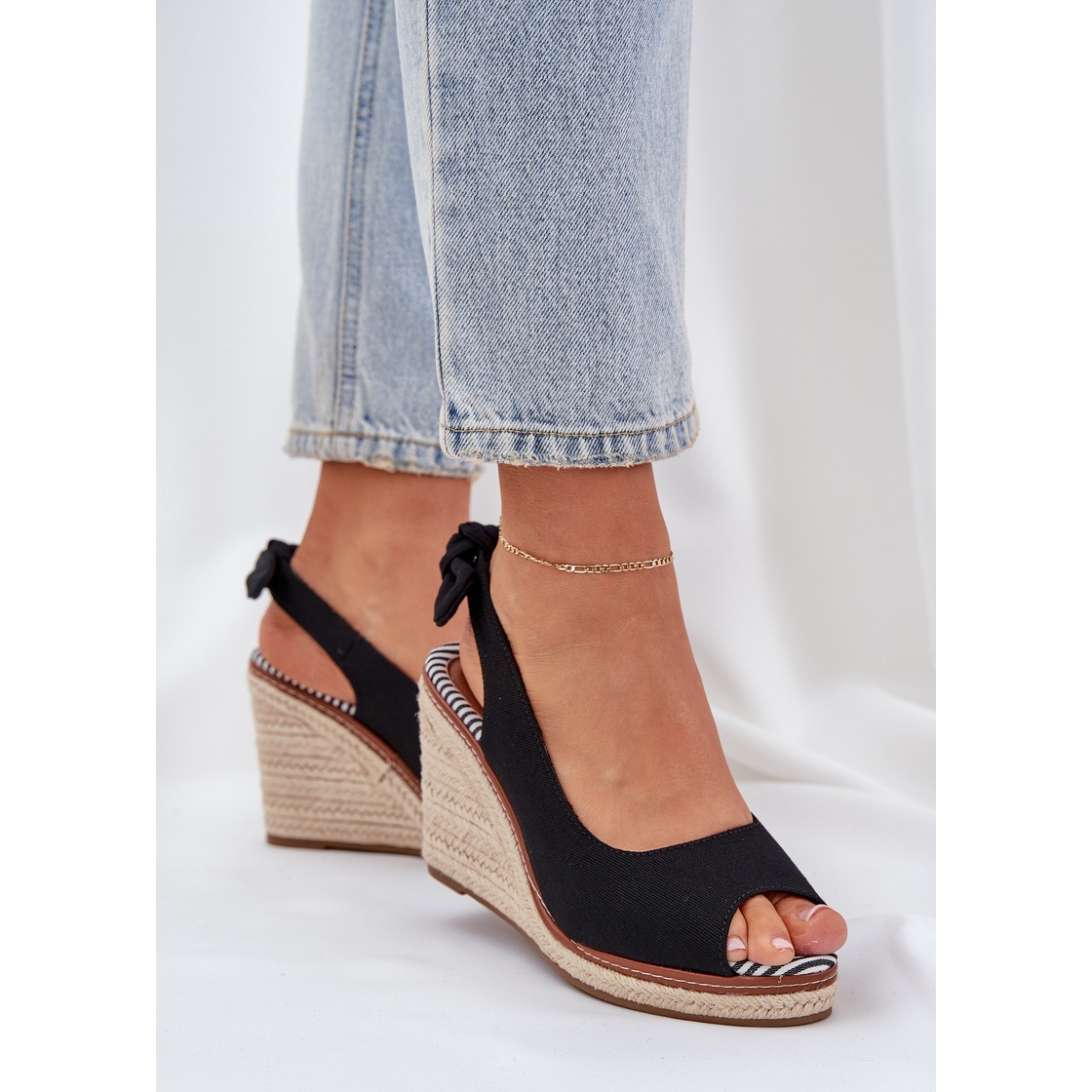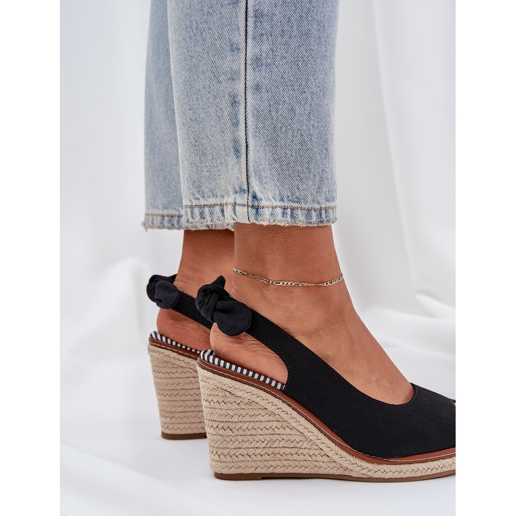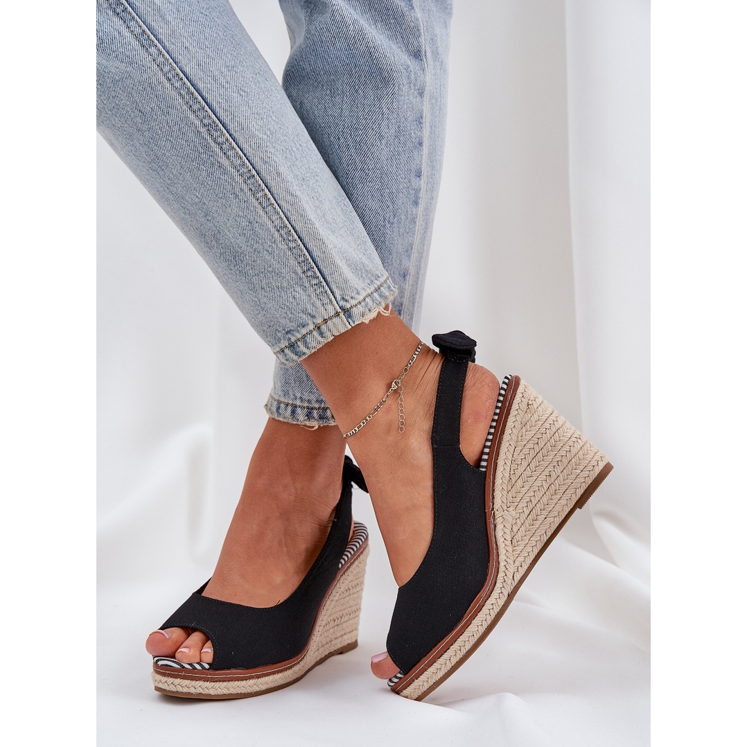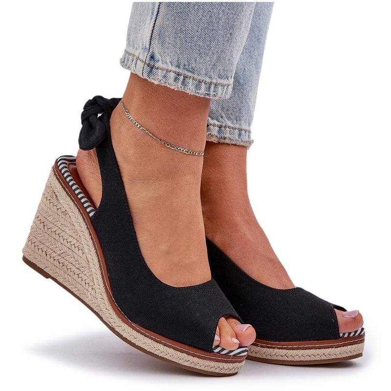 Les sandales de coin noir sont une proposition idéale pour les femmes à la recherche de commodité et de style les jours chauds. Fabriqués en matériau textile léger, ils assurent le confort même pendant les promenades plus longues. Un coin de haut de 9 cm, décoré d'une tresse, leur donne une grâce naturelle et une élégance.