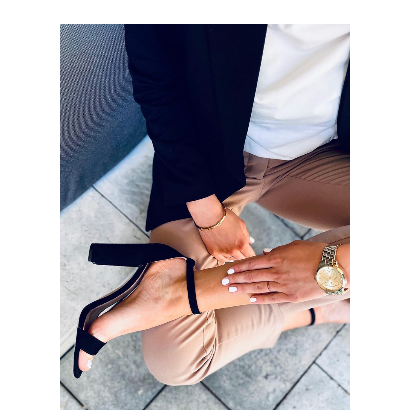 Leur couleur noire classique les rend extrêmement universels et se mélangent parfaitement avec diverses stylisations - du quotidien au soir. La farce à la mode à la cheville ajoute non seulement du charme, mais garantit également un ajustement parfait. Ces sandales mettront certainement l'accent sur chaque tenue, ce qui lui donne du style et de l'élégance.