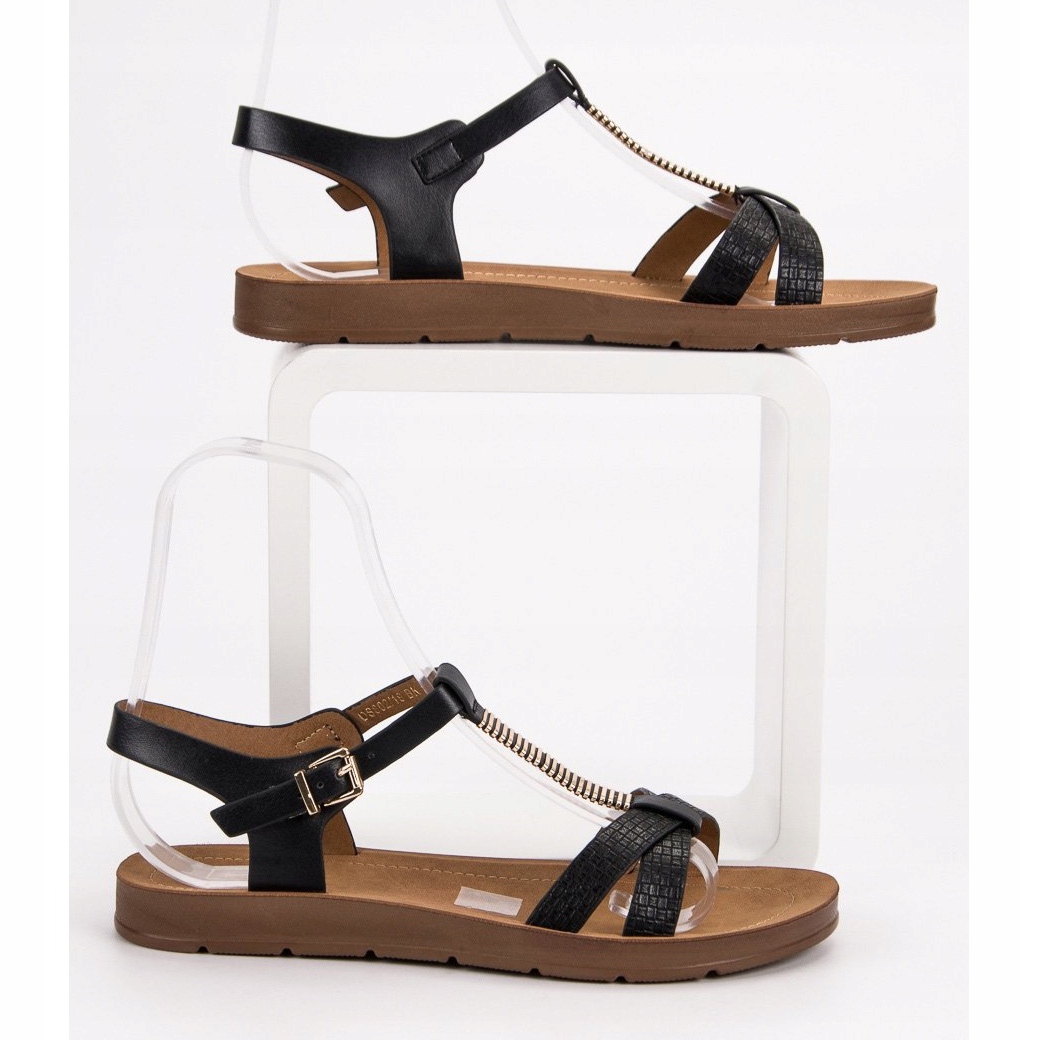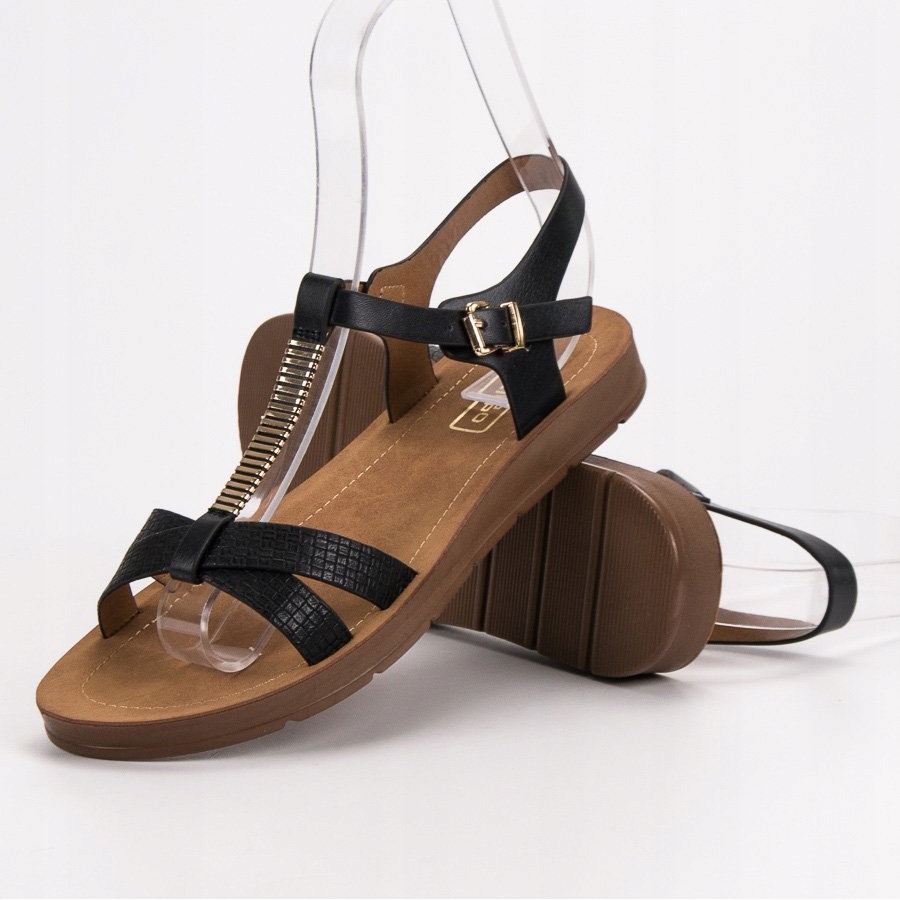 Ce modèle se caractérise par un talon plat de seulement 2 cm de haut, qui assure un confort lors des promenades quotidiennes. La semelle en matière synthétique est lisse, ce qui augmente encore le confort d'utilisation. Les sandales ont un talon ouvert et aucun bout, ce qui les rend parfaites pour les chaudes journées d'été.