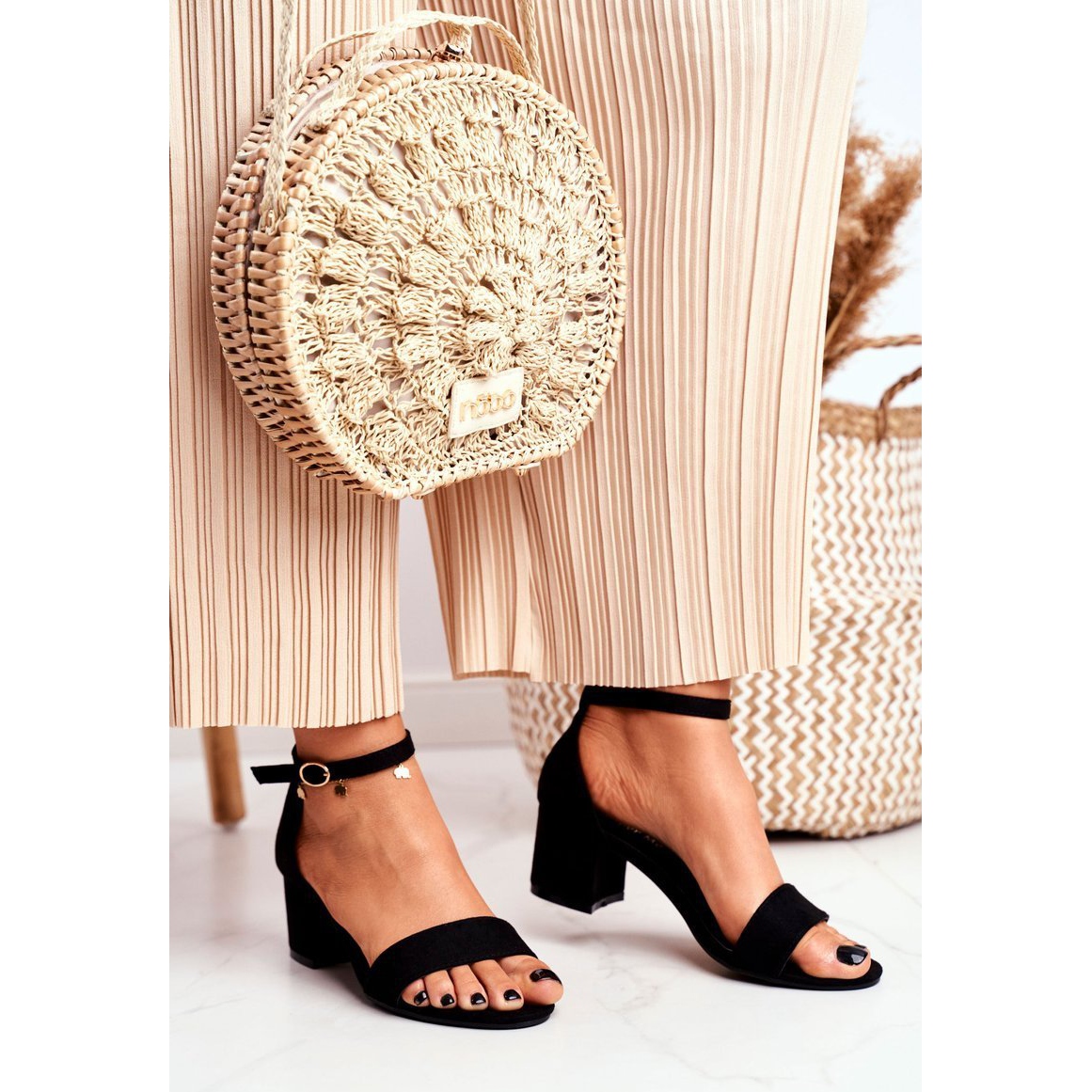 Les sandales sont fabriquées en cuir suédé écologique de haute qualité, ce qui leur donne un look élégant. La finition noire fait de ces chaussures un complément parfait à n'importe quelle tenue. Le matériau de la semelle intérieure est en cuir écologique, assurant confort et durabilité, et la semelle synthétique garantit une bonne adhérence.