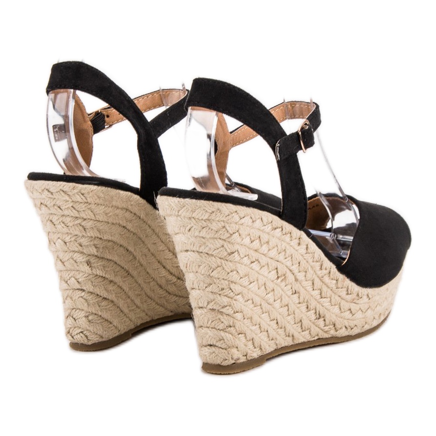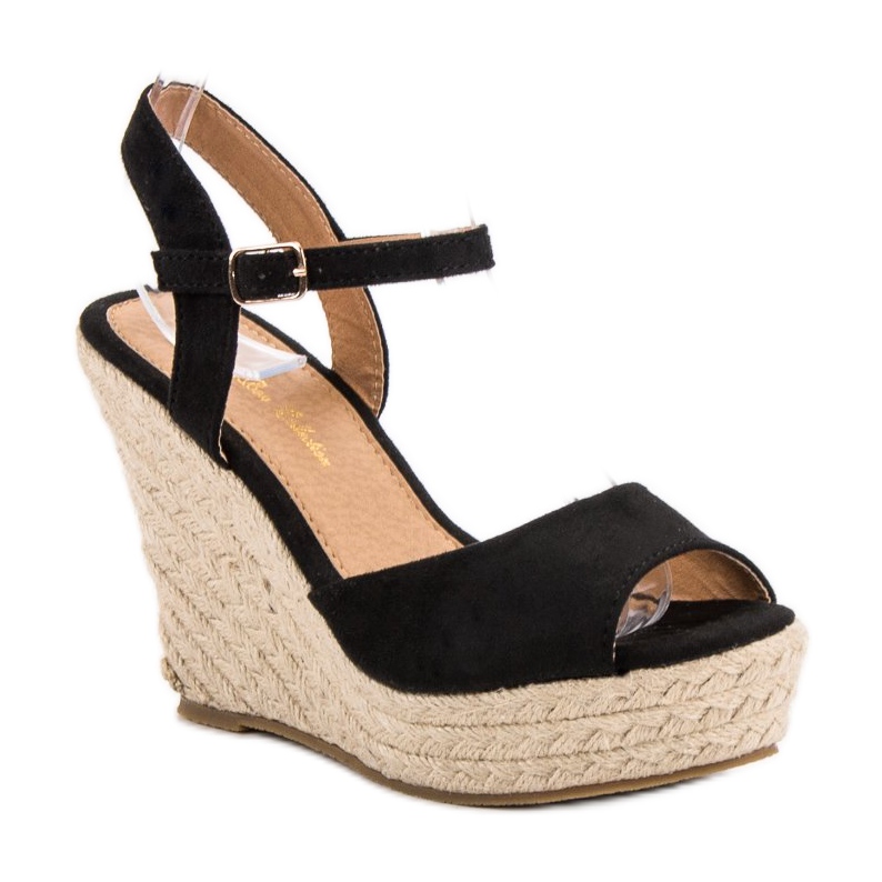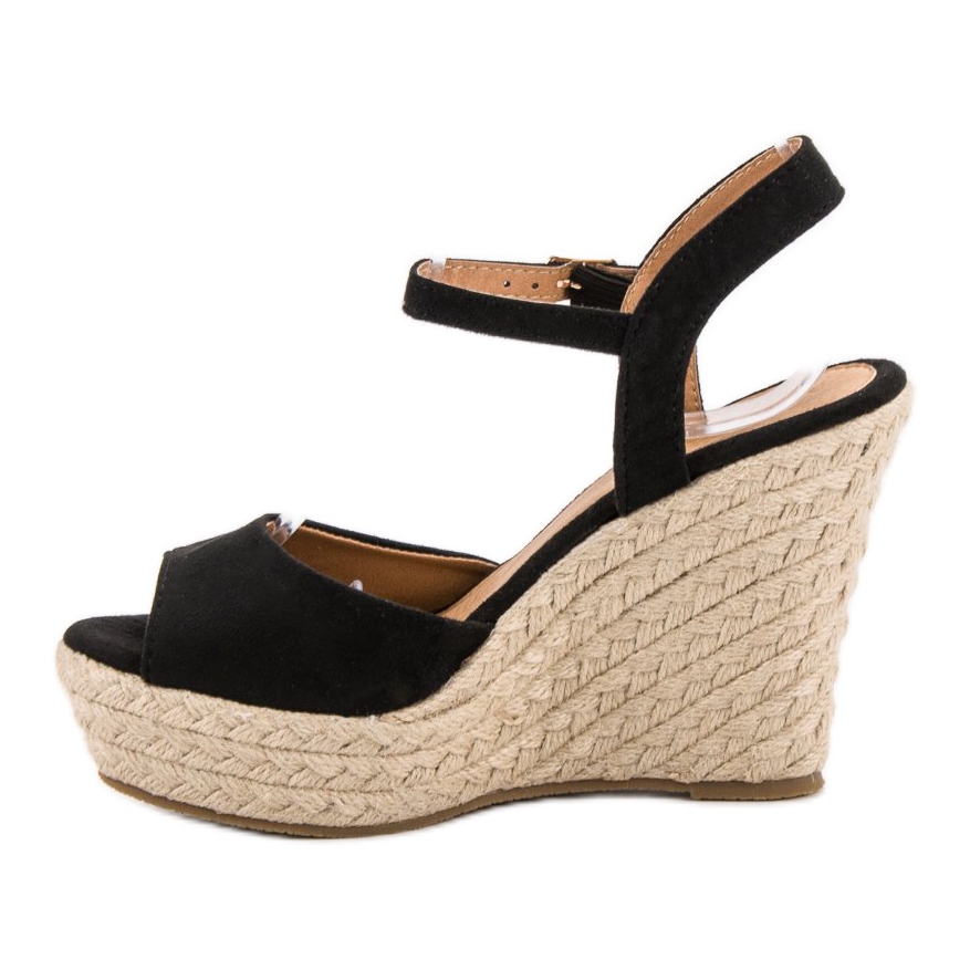 Fabriquées en cuir suédé écologique, les sandales sont luxueuses et leur couleur noire classique les rend assorties à toutes les tenues. La fermeture à boucle discrète garantit un ajustement parfait au pied, ce qui est crucial, notamment lorsque l'on porte des chaussures compensées. Grâce à la hauteur du talon de 11 cm et à la plateforme de 4 cm de haut, ces sandales allongent non seulement optiquement les jambes, mais assurent également stabilité et confort au porté.