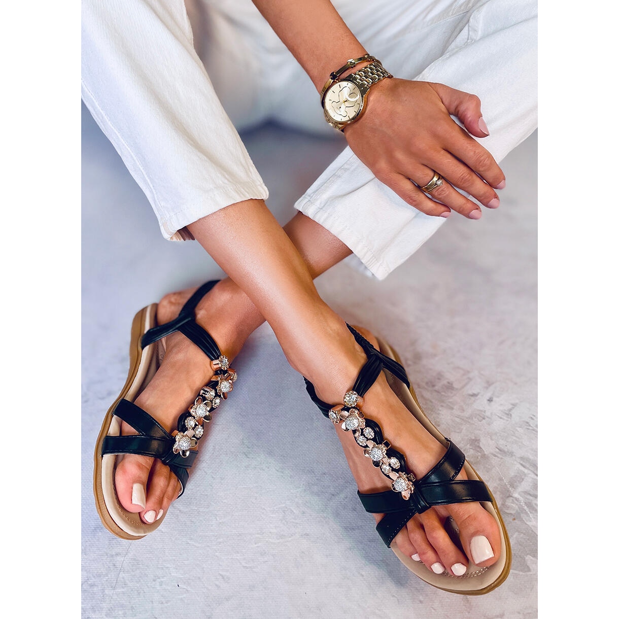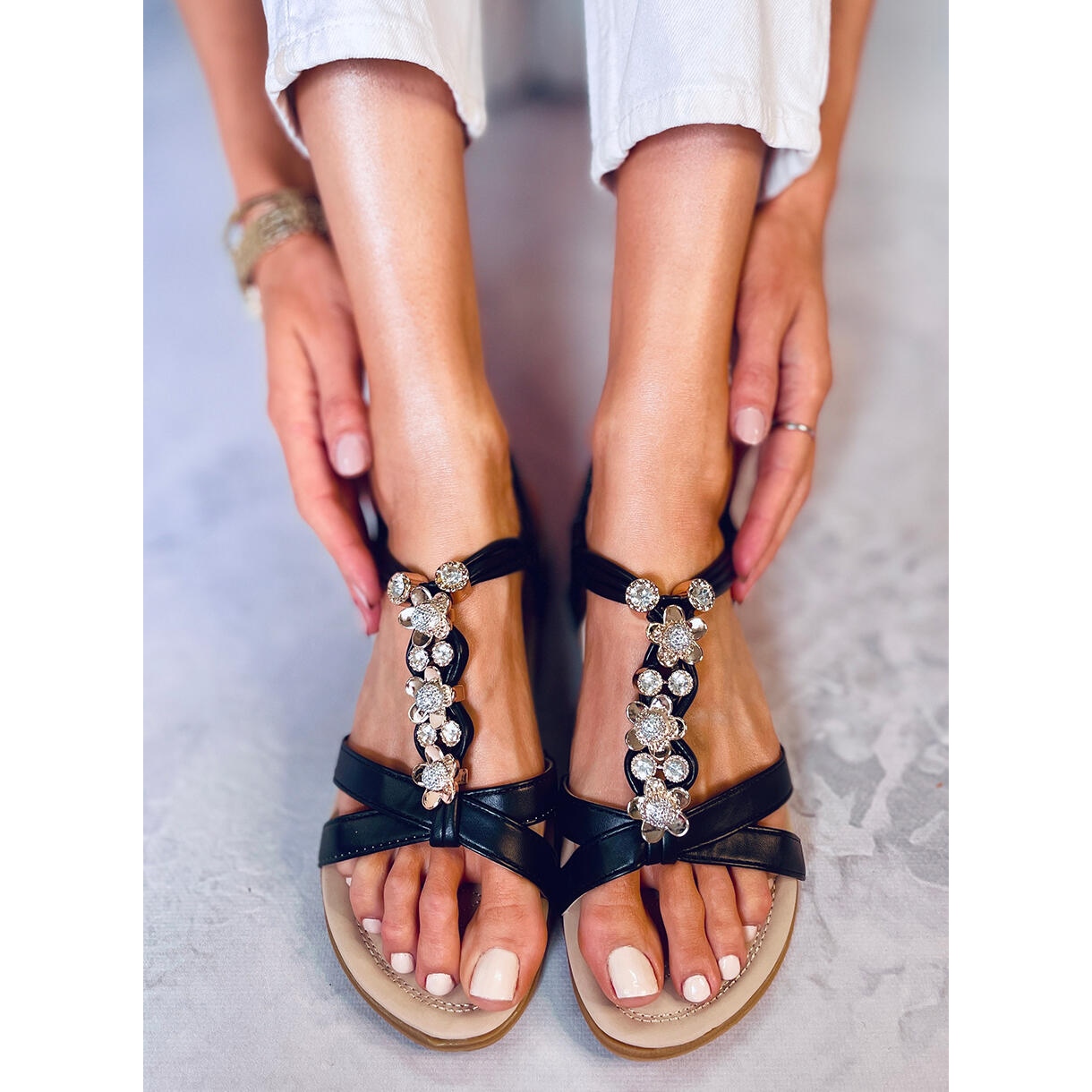 Découvrez les sandales noires pour femme CT-153 Black, qui sont le choix parfait pour les journées d'été, alliant élégance et confort au quotidien. Fabriquées en cuir écologique de haute qualité, ces sandales classiques séduisent par une application florale ornée de pierres brillantes qui leur confèrent un caractère unique.