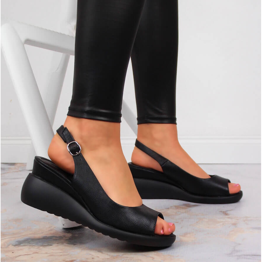 Sandales pour femmes sur le coin Sergio Leone - un classique dans une édition moderne. Noir, élégant et extrêmement confortable - parfait à la fois au quotidien et pour des sorties plus formelles. Fabriqué en cuir écologique de haute qualité, léger et solidement fini.