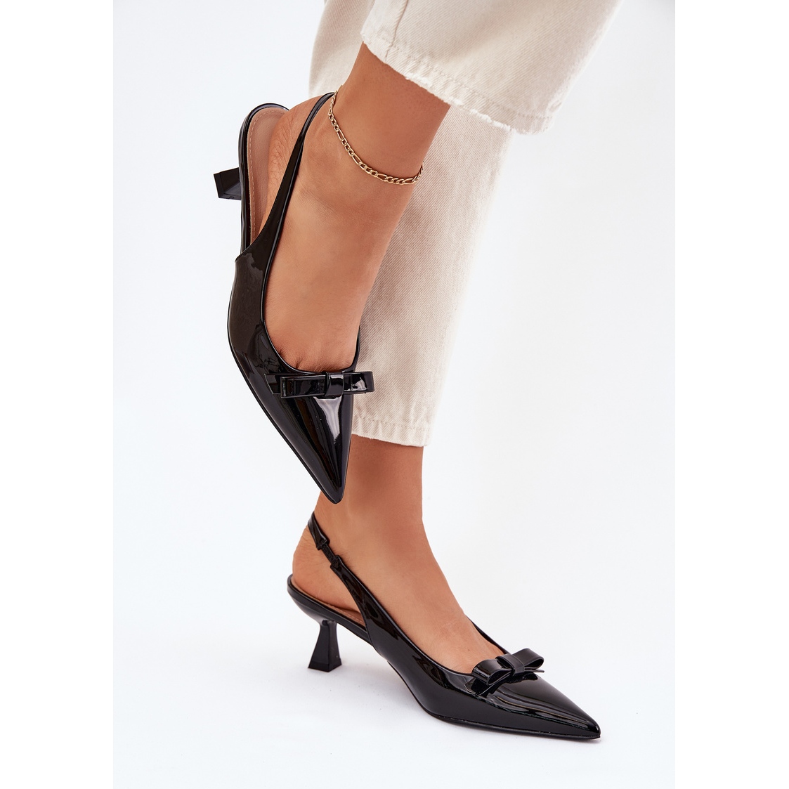 Découvrez l'élégance et la féminité avec des sandales verni sur une épingle avec un arc dans une couleur noire classique. Ces sandales féminines uniques, faites en cuir écologique de haute qualité, sont un excellent choix pour les occasions spéciales. Leur nez pointu ajoute de la minceur à la figure, et l'arc subtil placé à l'avant leur donne un charme unique.