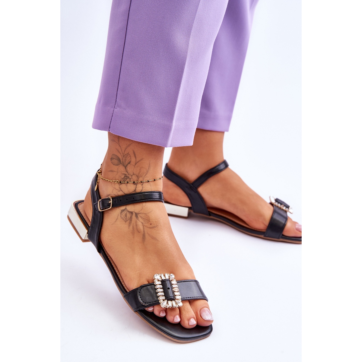 Les sandales plates à talons noirs sont un modèle élégant et classique de chaussures pour femmes. Fabriqués en matière écologique, ils offrent style et confort tout en traitant des enjeux éthiques. Equipé d'une décoration supplémentaire sur la sangle avant avec des cristaux qui leur donnent un look brillant et luxueux. Les sandales sont fermées par une bride réglable avec boucle, grâce à laquelle elles s'adaptent parfaitement au pied.