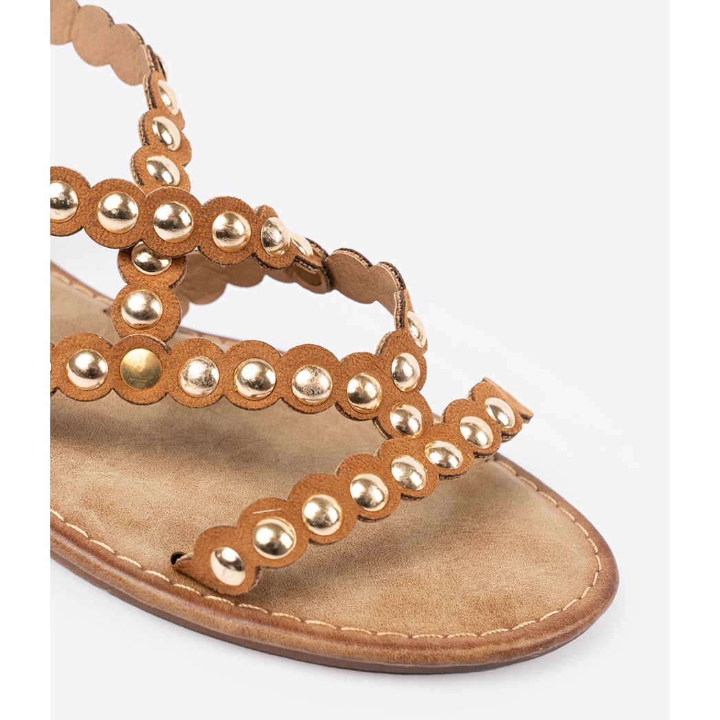 Détails: Sandales plates au caramel avec goujons beige
