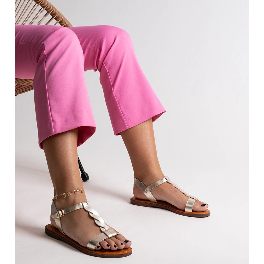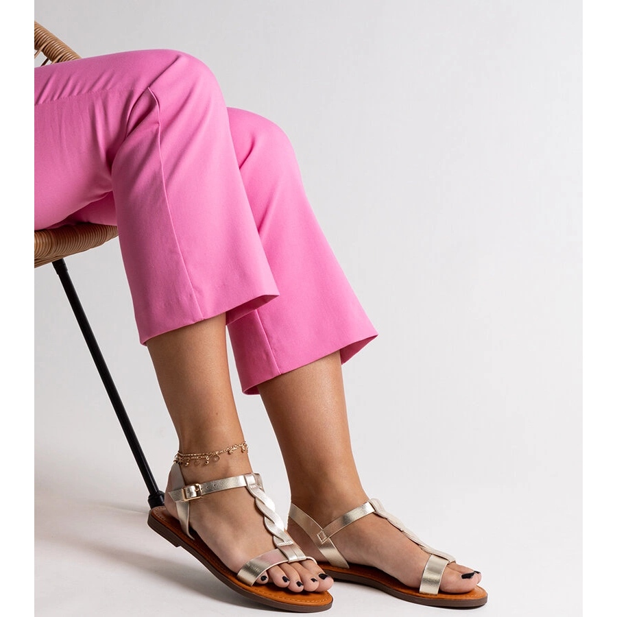 Nos sandales dorées sont caractérisées par un talon plat avec une hauteur de 1 cm, ce qui garantit le confort toute la journée. Grâce à la forme et à la boucle insérées, il est facile à mettre et à décoller, ce qui est particulièrement important les jours chauds. La semelle en caoutchouc marron leur donne de la stabilité et le manque de nez les rend parfaits pour les journées d'été chaudes.