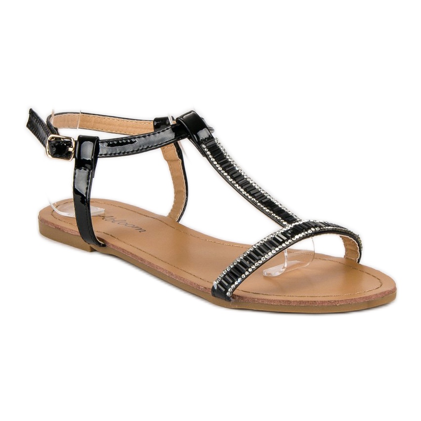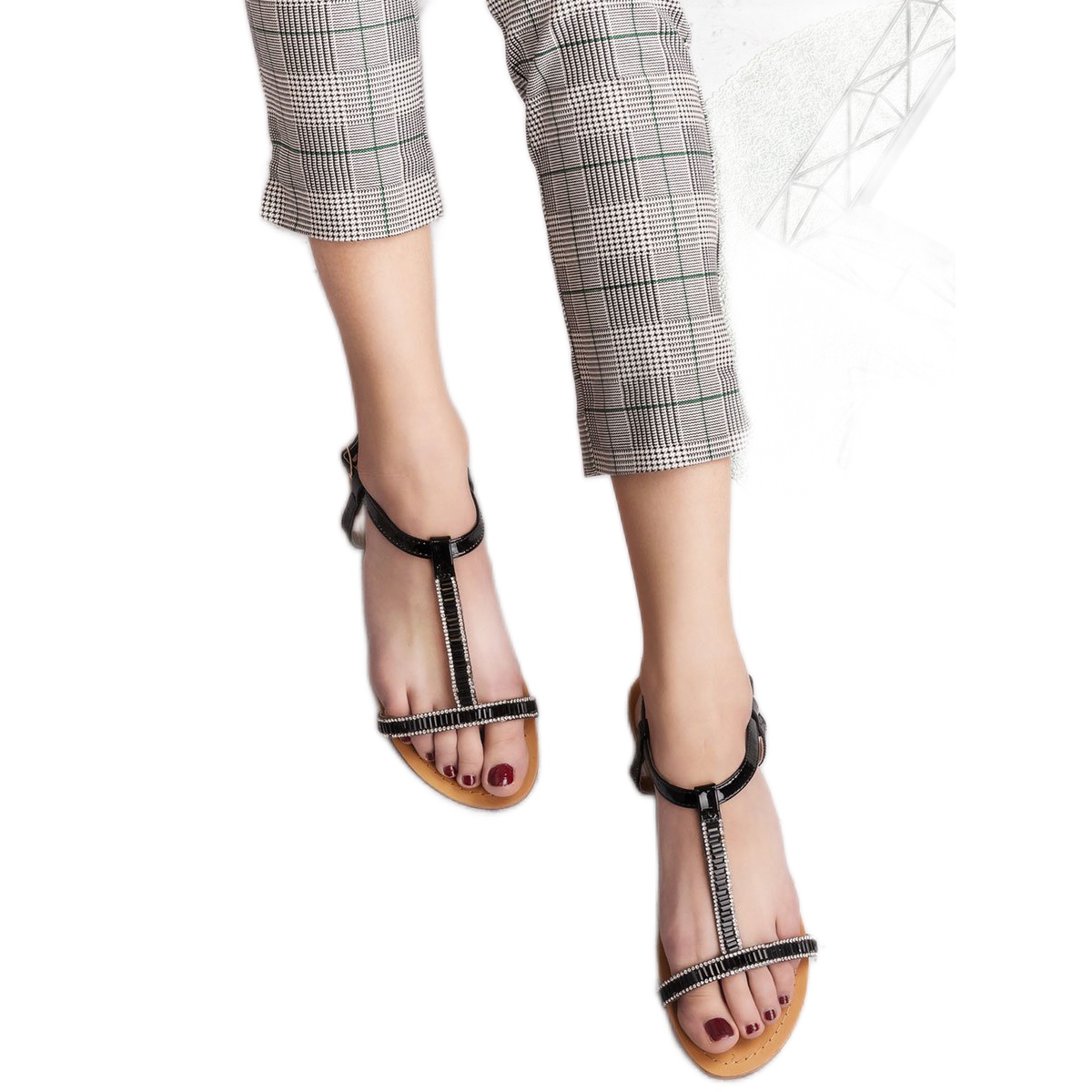 Découvrez l'élégance avec des sandales Abbloom uniques ! Ces belles sandales noires pour femmes à semelle plate sont le choix parfait pour les journées d'été. Fabriqués en cuir écologique verni, ils se distinguent par des rayures décoratives ornées de perles et de cristaux, ce qui leur confère un caractère subtil mais élégant.