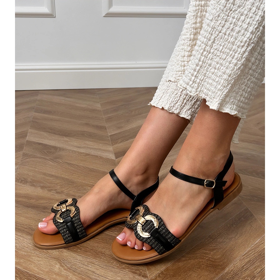 Les sandales plates noires avec une décoration dorée sont un incontournable dans la garde-robe d'été de chaque femme qui veut combiner le style et le confort. Leur design élégant et minimaliste les rend universels et se mélangent parfaitement avec des stylisations décontractées et plus formelles.