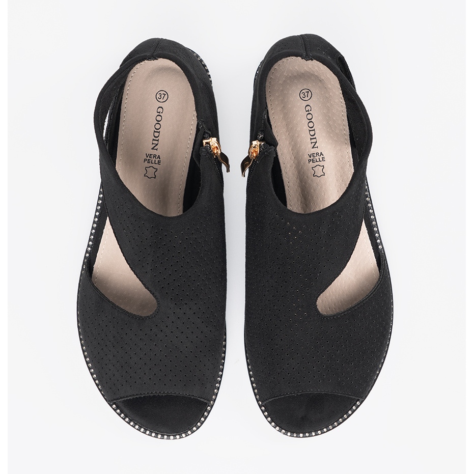 Découvrez l'élégance et le confort avec des sandales plates ouvertes noires de la célèbre marque Goodin. Ces chaussures uniques sont la combinaison parfaite de classiques et de modernité, qui s'adaptent parfaitement aux tendances estivales. Fabriqué en cuir en daim écologique de haute qualité, les sandales se réjouissent de leur conception d'origine, et leurs détails ouverts et leurs strass subtiles ajoutent une lueur unique.