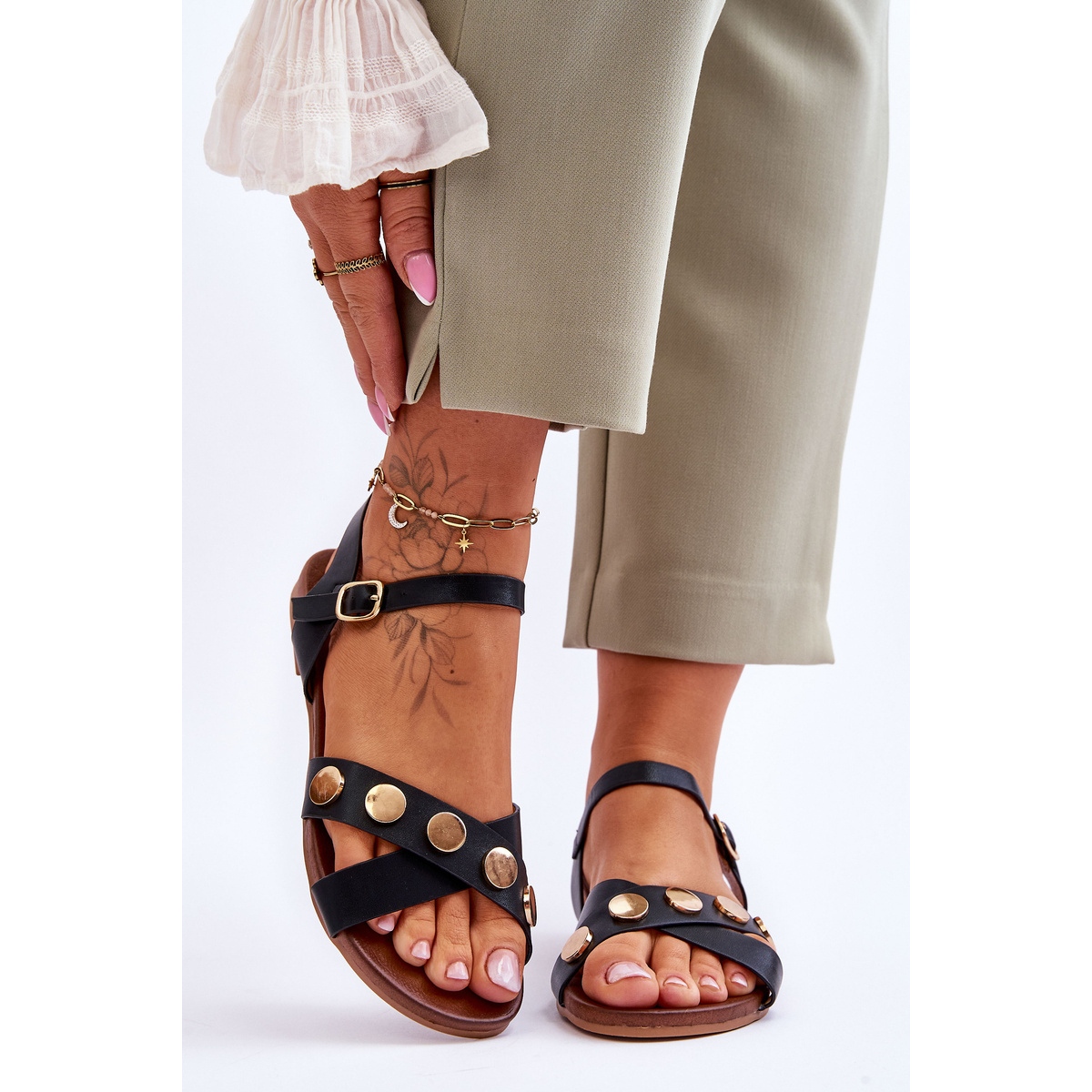 Sandales féminines élégantes et confortables en cuir écologique de haute qualité. Le modèle se distingue par une décoration subtile sous forme de roues et de strass métalliques et d'une ceinture de boucle réglable qui assure un ajustement parfait. Un talon plat (1 cm) et une semelle en caoutchouc non glissante de garantie pendant les usures quotidiennes.
