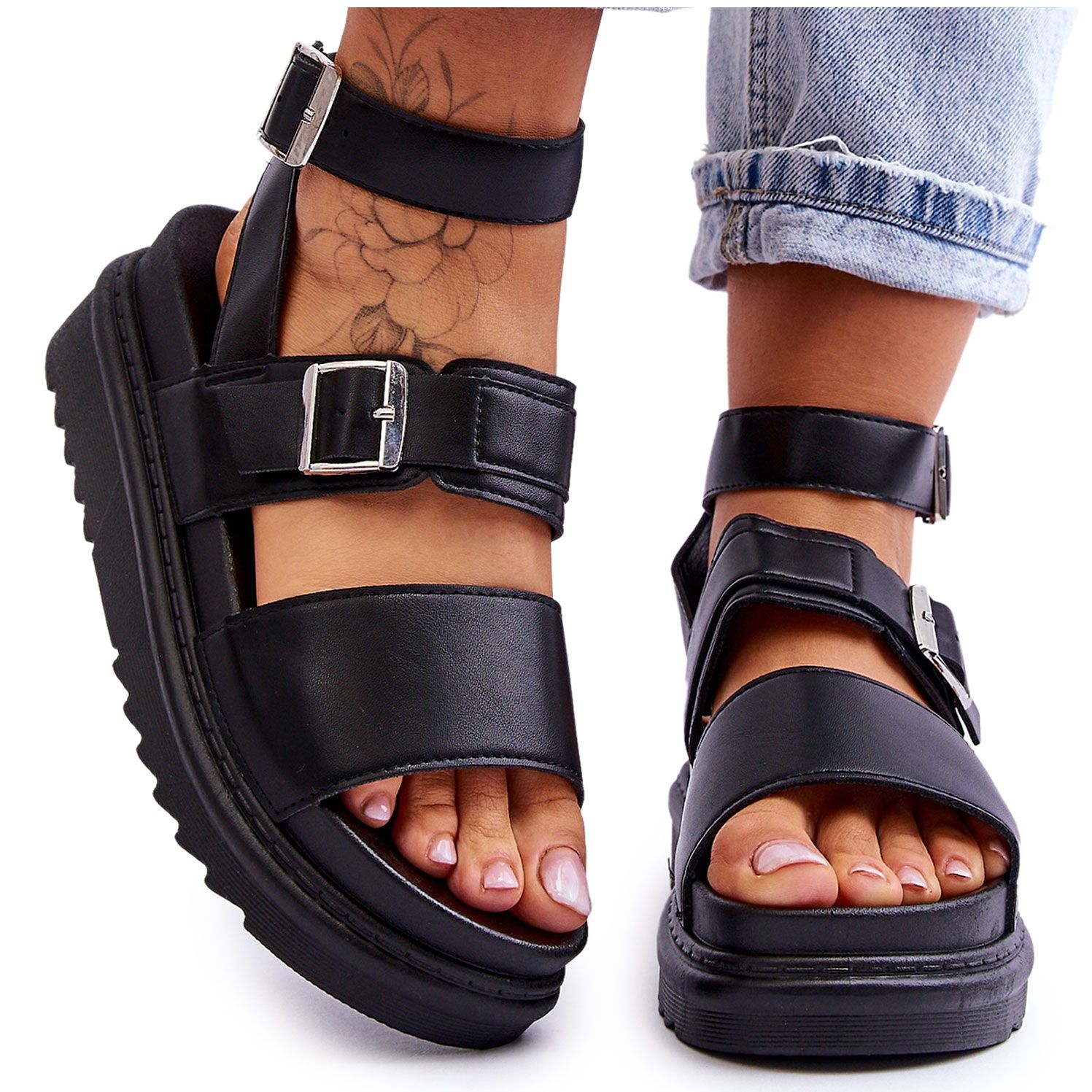 Une plateforme massive de 5,5 cm de hauteur, également en plastique, assure stabilité et confort même en cas de port prolongé. La semelle noire durable est non seulement fonctionnelle, mais donne également un look distinctif. C'est un choix idéal pour les femmes qui apprécient le confort sans renoncer aux tendances de la mode.