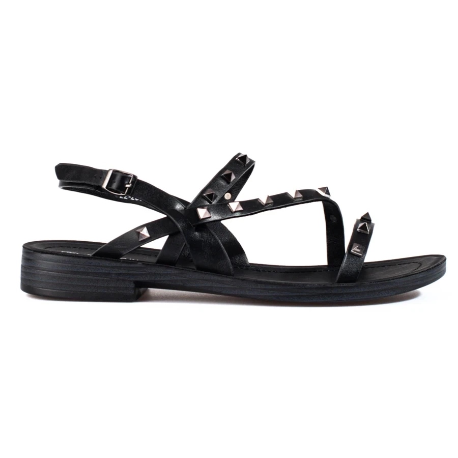 Sandales élégantes et quotidiennes de la marque romaine W. Potocki en noir universel. La coupe classique avec des goujons décoratives leur donne un personnage à la mode et le design ouvert garantit le confort de porter les jours plus chauds. Parfait pour les stylisations décontractées - des shorts et des robes en jeans.