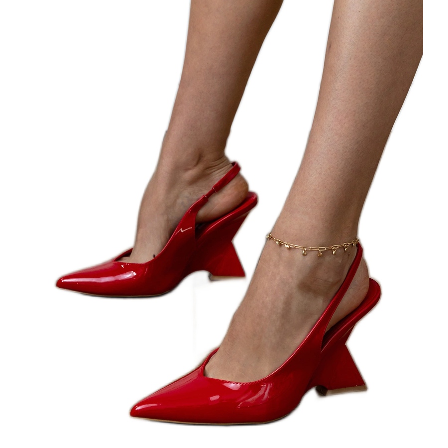 Découvrez les sandales rouges uniques sur un coin géométrique qui introduira la fraîcheur dans votre garde-robe d'été. Ces chaussures élégantes, faites de cuir écologique verni de haute qualité, combinent un style moderne avec un confort de port maximal.