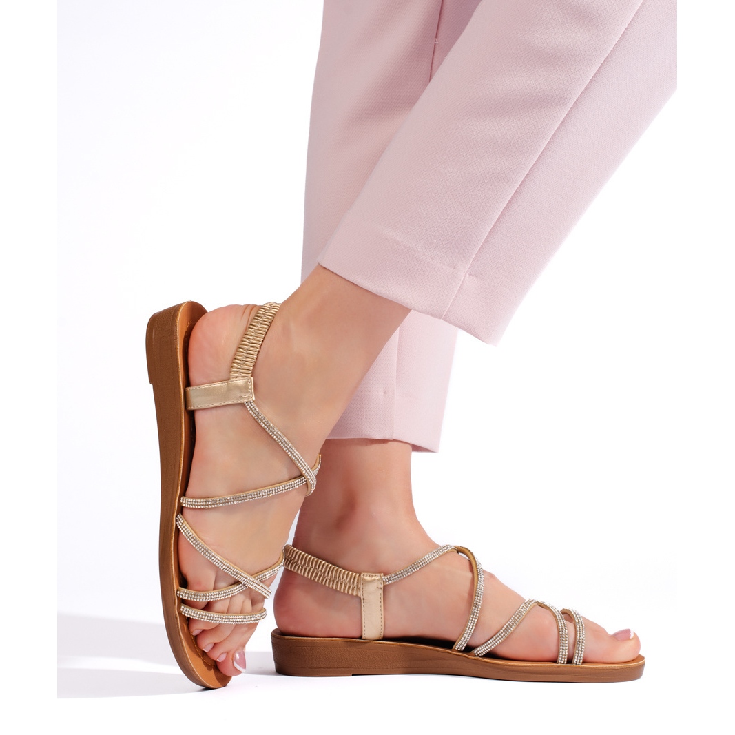 Nous vous présentons des sandales à enfiler dorées exclusives, décorées de zircones cubiques, parfaites pour toutes les femmes qui apprécient l'élégance et la haute qualité de fabrication. Ces sandales sont l'essence même d'un design luxueux, combinant un look tendance avec un confort de port extraordinaire.