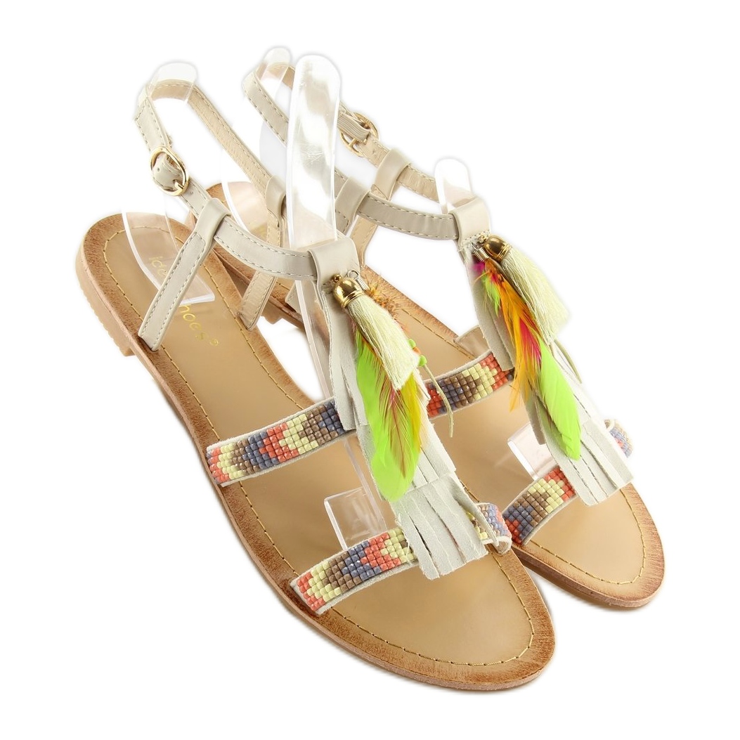 Les sandales sont décorées d'applications de mosaïque brillante, de franges et de plumes délicates, ce qui les rend accrocheuses et se démarquent dans la foule. La couleur beige se marie parfaitement avec d'autres nuances, créant un ensemble cohérent et harmonieux.