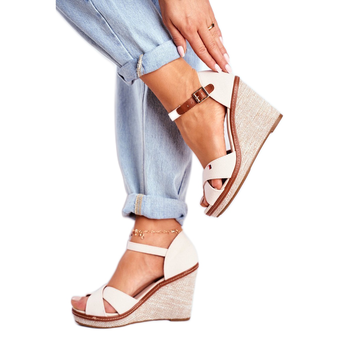 L'un des avantages de ce modèle est sa fonctionnalité. Les sandales ont une boucle autour de la cheville, ce qui permet un enfilage rapide et confortable. De plus, une cale de 9,5 cm de hauteur offre non seulement du confort, mais rehausse également efficacement la silhouette, lui conférant légèreté et élégance. Décorer la cale avec un matériau tressé ajoute un charme unique à l'ensemble.