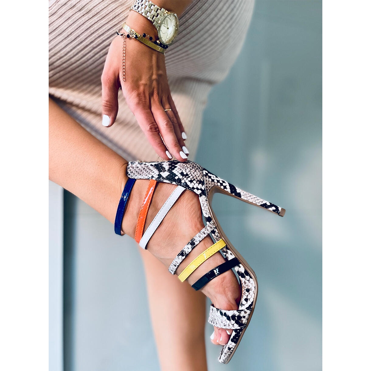 Les sandales se caractérisent par un motif peau de serpent, qui donne un peu de sauvagerie et de caractère, parfaitement adapté aux tendances de la mode actuelle. Un stylet fin de 11 cm de haut allonge optiquement les jambes, rendant tout style plus élégant. La fermeture éclair à l'arrière est un détail pratique qui permet d'enfiler et de retirer facilement les chaussures.