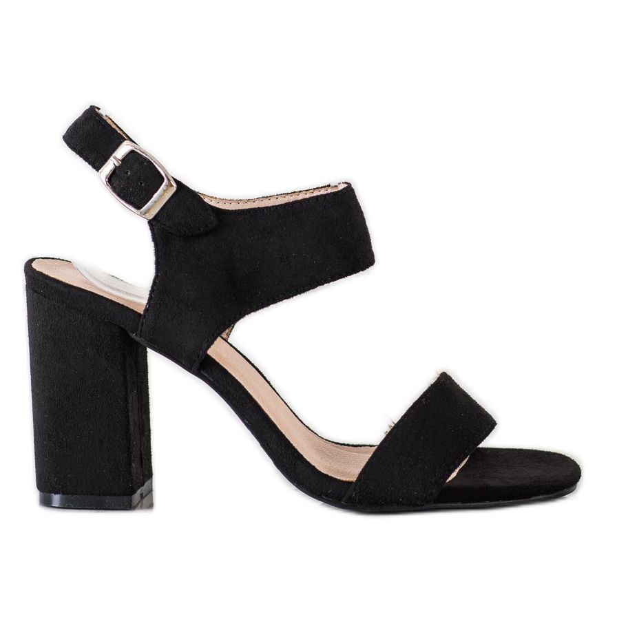 Fabriquées en cuir suédé écologique noir, les sandales impressionnent par leur style minimaliste. Les bouts ouverts et le contrefort du talon donnent à vos pieds un aspect mince et féminin. Une large bride au-dessus des orteils et une seconde, avec une boucle élégante, enroulée autour du mollet, soulignent non seulement les avantages de la silhouette, mais assurent également la stabilité pendant la marche.