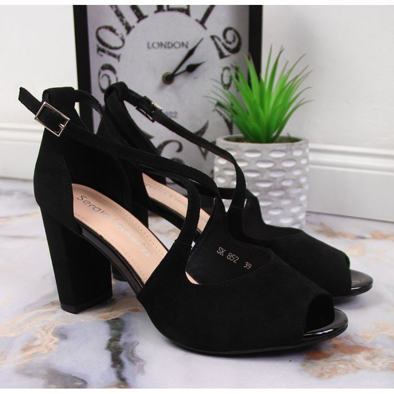 Sandals sur le Sergio Leone Post dans SK210C - un classique en noir, qui fonctionnera dans les stylisations d'été. Une coupe élégante avec un bout ouvert et un talon stable comme un poteau (8,5 cm) combine un look féminin avec le confort de porter. Parfait pour tous les jours et pour les sorties du soir.
