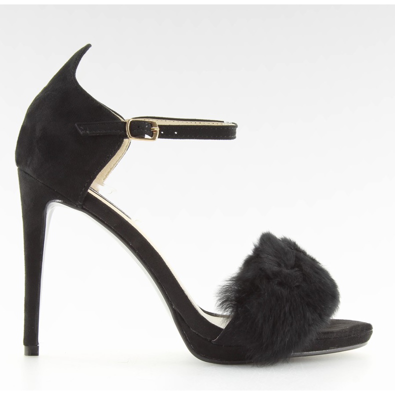 Sandales noires élégantes avec un talon fin haut de 11 cm. Une large bride ornée de fourrure duveteuse ajoute de la sensualité et un caractère unique, et une bride avec boucle à la cheville stabilise la chaussure et assure un maintien sûr sur le pied. Le modèle est en daim écologique, la semelle intérieure est également en cuir écologique. Le bout ouvert souligne la silhouette féminine du pied - parfait pour les soirées et les occasions spéciales.