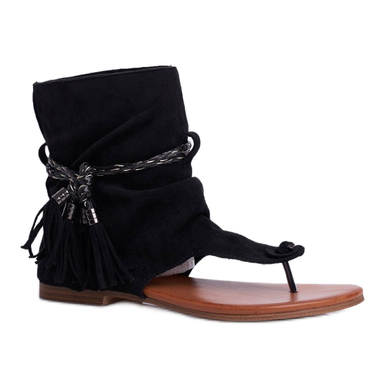 Ces tongs noires avec franges supplémentaires sont une combinaison parfaite de style classique et d'accents à la mode. Fabriqués en cuir suédé écologique de haute qualité, ils seront un complément parfait à tout style estival. Elles ont un talon plat de 2 cm de haut, ce qui les rend extrêmement confortables même lorsqu'elles sont portées longtemps.