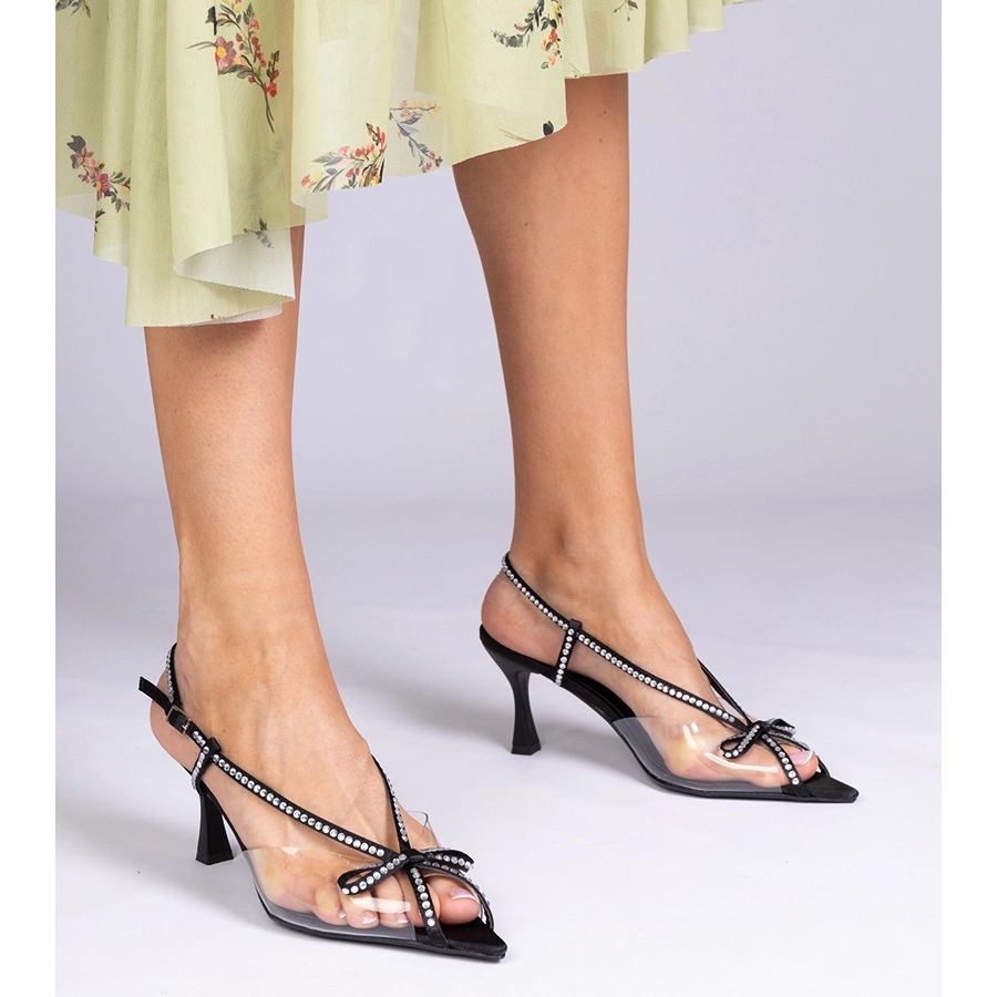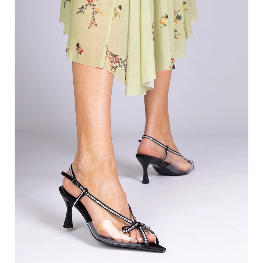 Choisissez des sandales transparentes noires sur une épingle avec des zircons et sentez-vous exceptionnellement dans chaque situation! Il s'agit d'un incontournable qui ajoutera de la brillance à chaque étape.