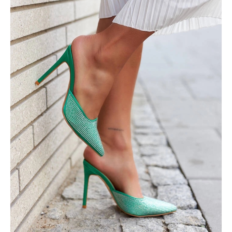 Les tongs phénoménaux sur les talons hauts d'Ortensio sont une proposition pour les femmes qui veulent ajouter de l'élégance et de la splendeur aux stylisations d'été. Un talon mince de 10 cm et un nez pointu allongent magnifiquement la jambe, et le talon découvert donne la légèreté. L'ensemble est en cuir écologique dans une teinte verte à la mode et modérée, décorée de zircons subtils - parfait pour les sorties du soir et les événements d'été.