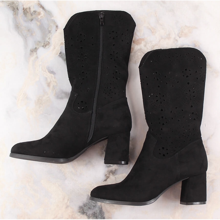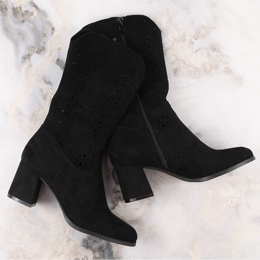 Les bottes cowboy de printemps noires pour femmes M. Daszyński SA156-11 sont un choix idéal pour les femmes qui recherchent une combinaison de style à la mode et de confort. Fabriquées en cuir suédé écologique de haute qualité, ces bottes élégantes se distinguent par une finition subtile et ajourée qui leur confère un caractère unique.