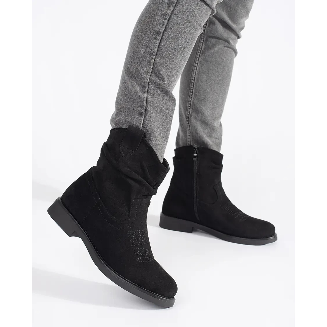 Découvrez des bottines cowboy plates en daim noir pour femme qui allient élégance et confort. Ces bottines uniques s'intègrent parfaitement dans le style décontracté, s'adaptant parfaitement aux tenues de tous les jours et aux tenues plus élégantes.