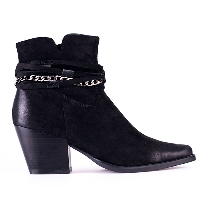 N'hésitez pas à porter ces bottines aussi bien pour les occasions du quotidien que pour les moments spéciaux. L'élégante couleur noire et la chaîne décorative, qui est un élément de design original, assureront une belle apparence. La hauteur du talon est confortable de 7 cm - une solution parfaite pour allier esthétique et confort.