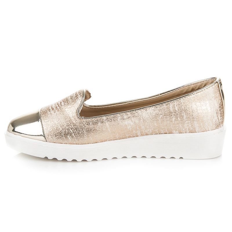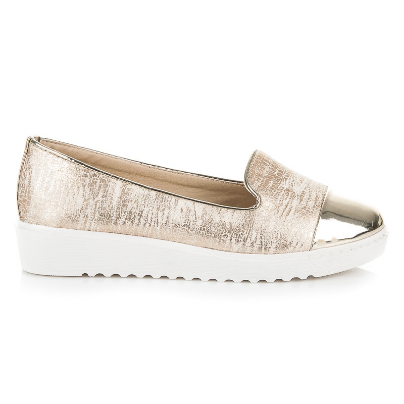 Leur couleur dorée leur confère un caractère unique, complétant parfaitement les styles du quotidien comme du soir. De plus, le bout rond et la plateforme de 3 cm de hauteur garantissent un confort de port tout au long de la journée. La fermeture à enfiler permet d'enfiler et de retirer les chaussures extrêmement facilement.