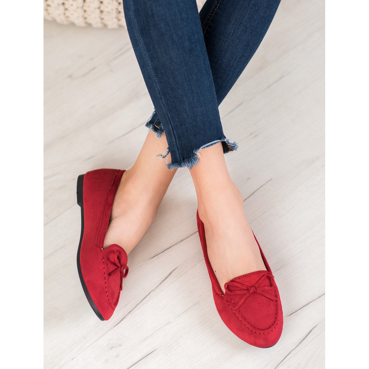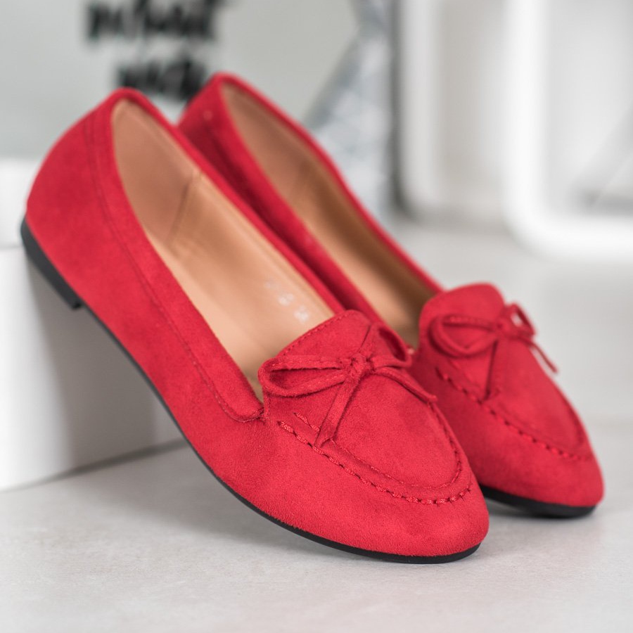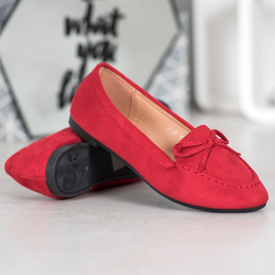 La tige en cuir suédé écologique de haute qualité d'une couleur rouge juteuse attire l'attention et les coutures décoratives sur le devant ajoutent du chic. Les orteils sont fortement arrondis, ce qui assure un confort de port, et un délicat nœud en ruban placé sur le dessus donne aux chaussures un aspect particulièrement charmant.