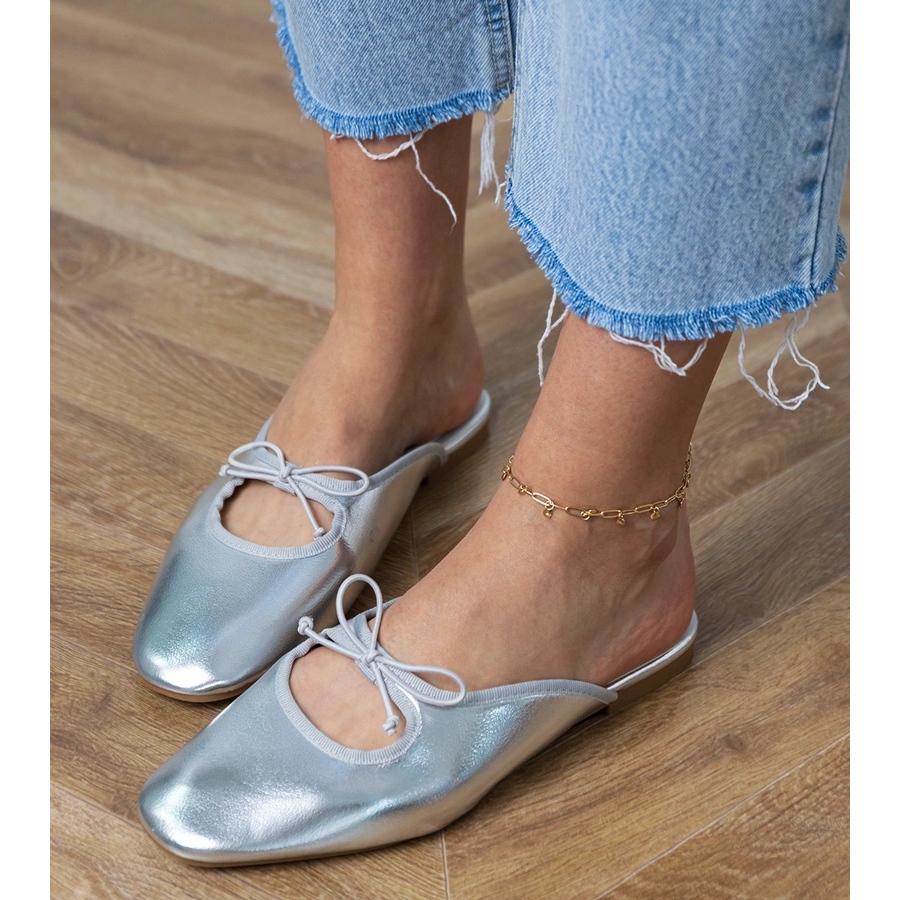 Les pantoufles se distinguent par une couleur argentée métallique, ce qui leur donne un caractère moderne et se mélange bien avec diverses tenues. Un talon plat avec une hauteur de 1 cm les rend extrêmement pratiques et en même temps à la mode. Un nez carré et un arc charmant sont des détails supplémentaires qui mettent l'accent sur leur coupe unique.