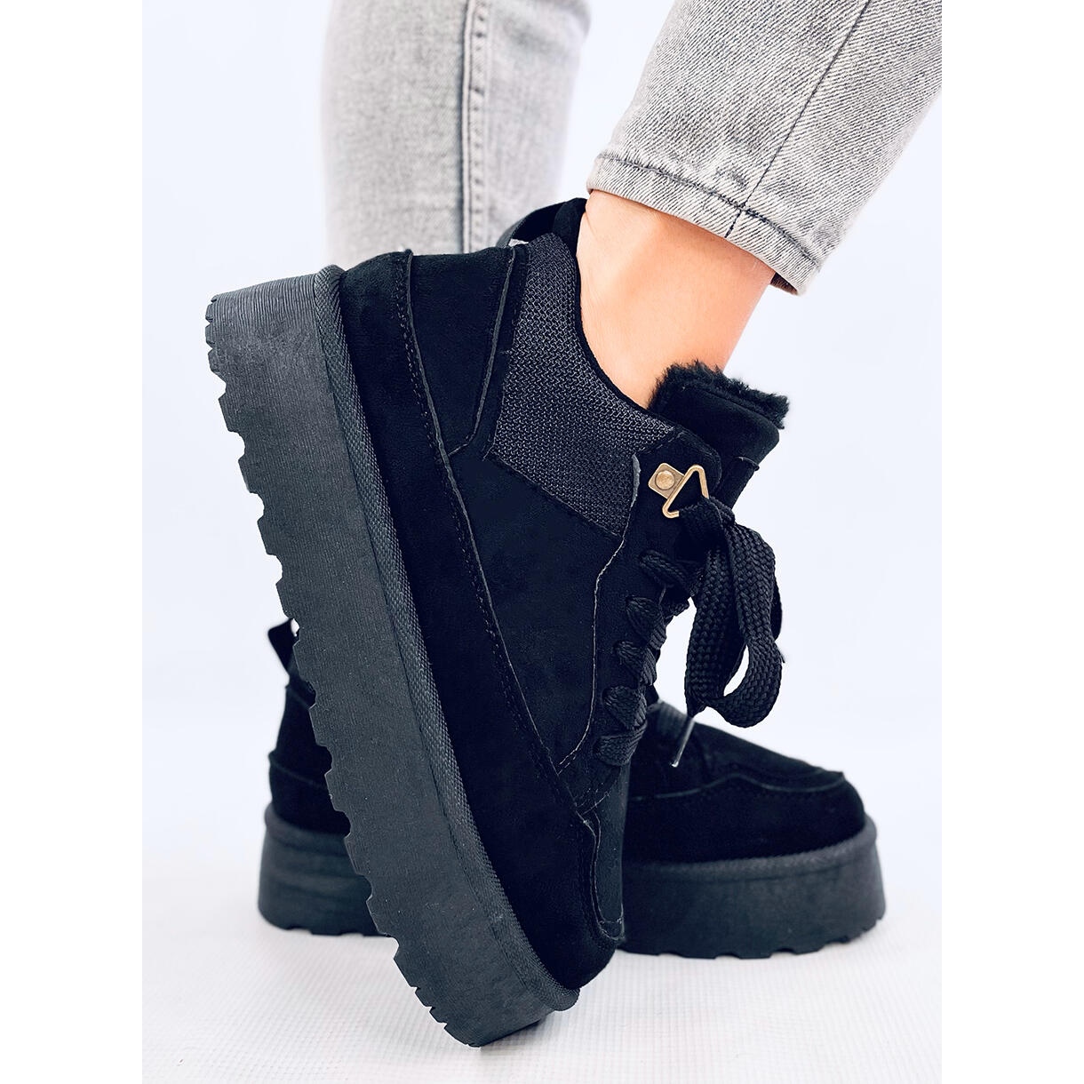 L'isolation intérieure avec une fourrure épaisse assure un confort thermique, particulièrement important les jours les plus froids. La coupe design des baskets sur une plateforme de 4 cm de hauteur et les lacets originaux et épais les rendent uniques et tendance. Le bout rond les rend non seulement élégants, mais aussi confortables à porter, s'adaptant parfaitement au pied.